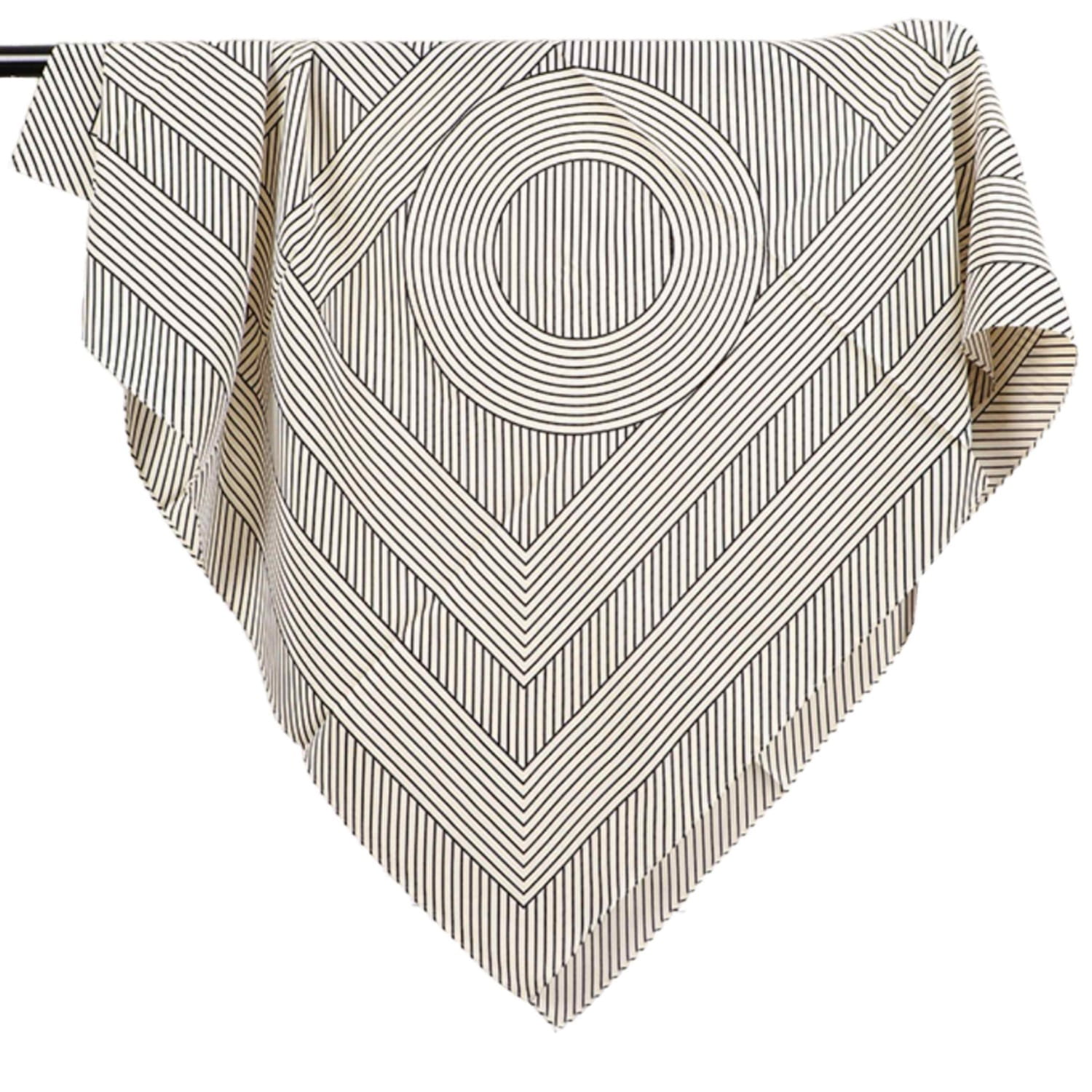 Apaszka 90x90 w biało-czarne pasy i geometryczne okręgi – idealna dla miłośniczek minimalizmu i elegancji.