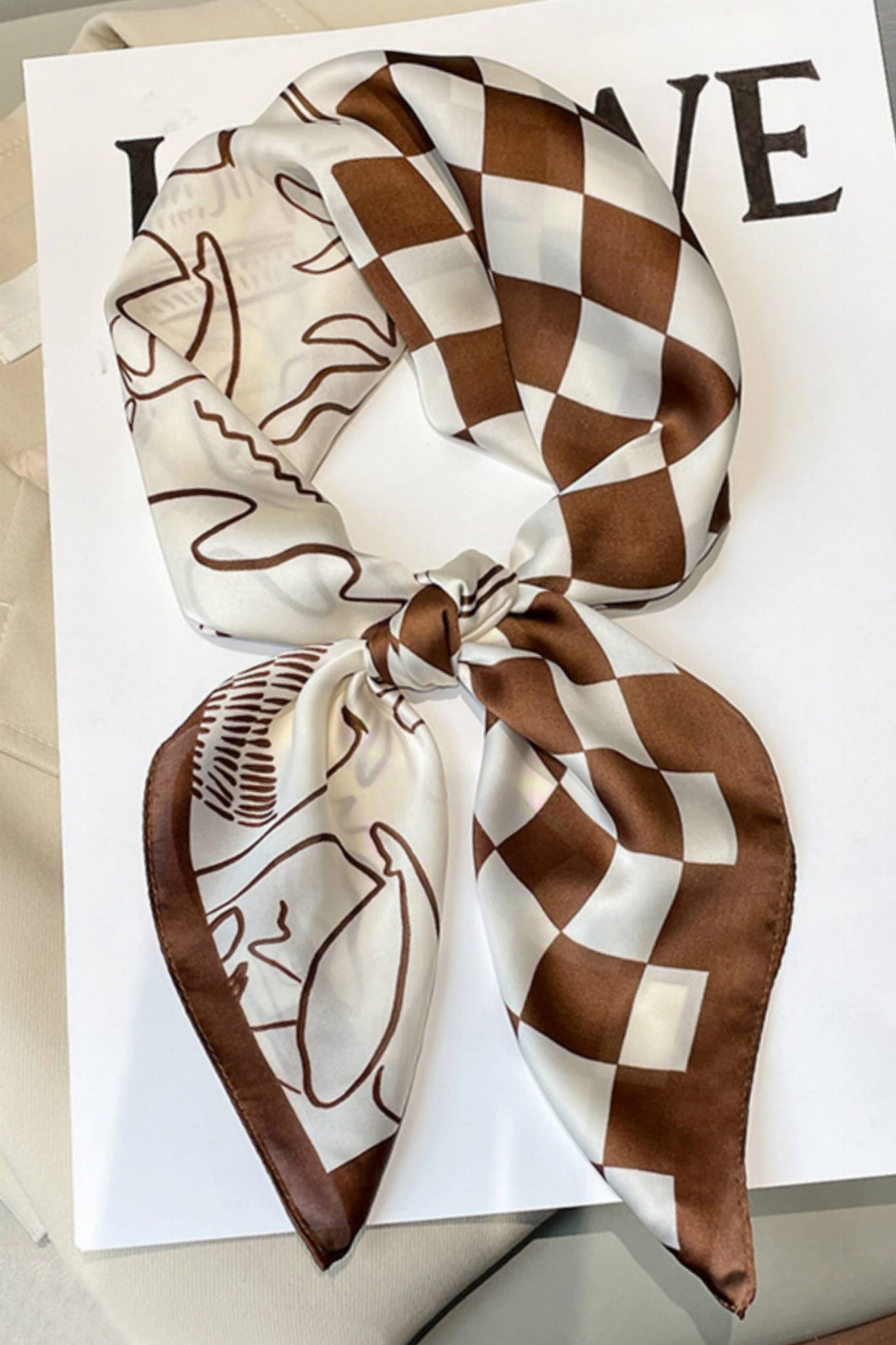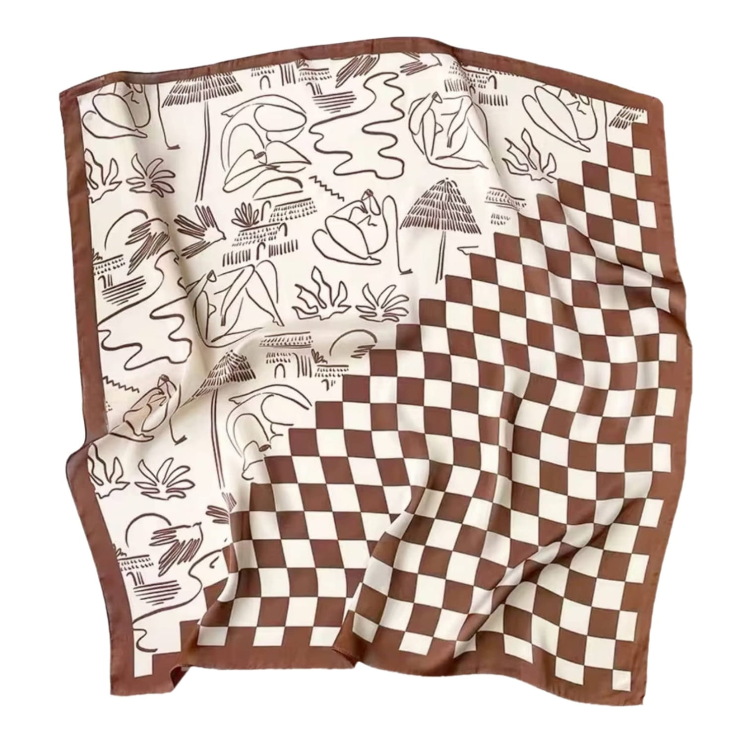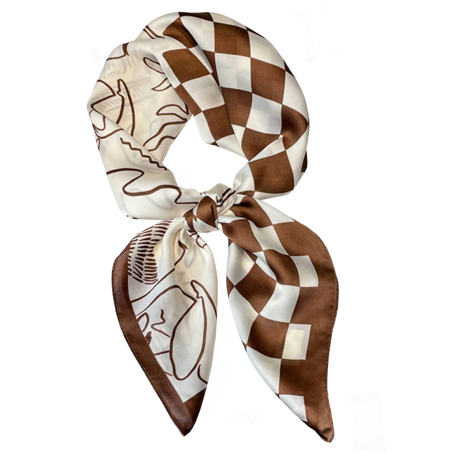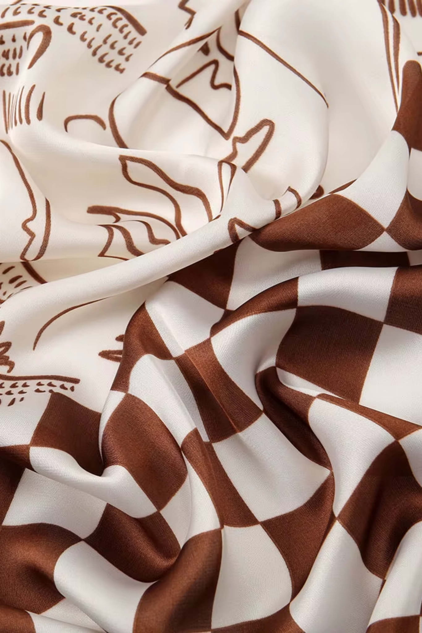 Apaszka 70x70 w odcieniach brązu – line art i szachownica w artystycznym wydaniu.