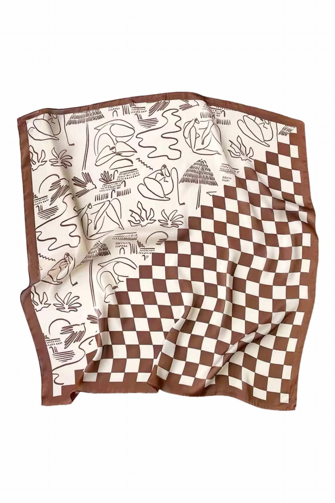 Apaszka brązowo-kremowa 70x70 – ilustracje i szachownica