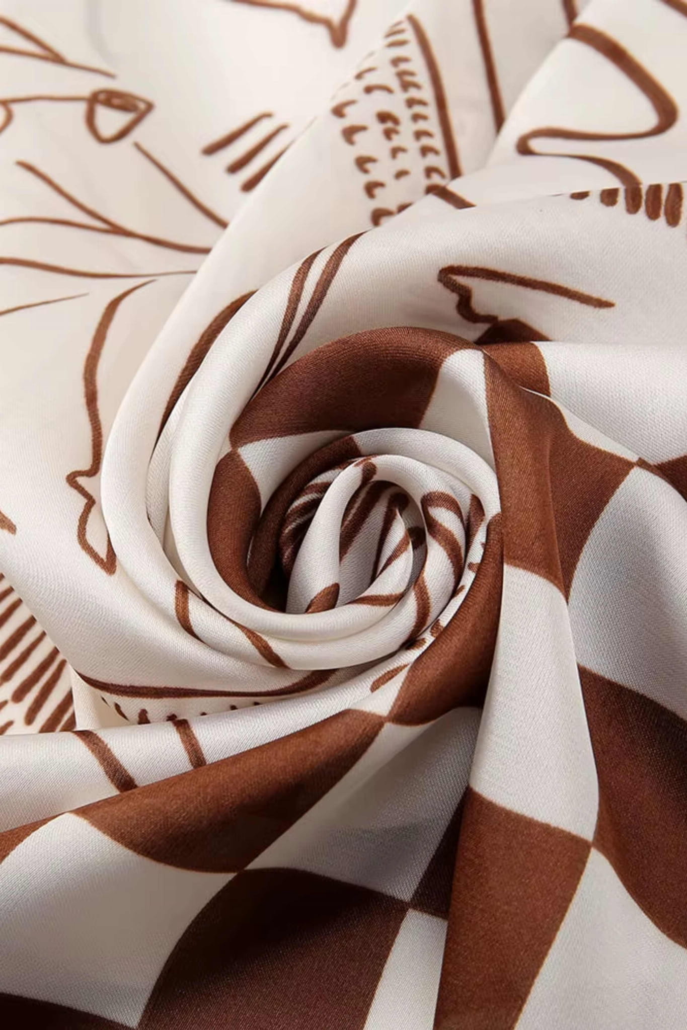Ta brązowo-kremowa apaszka 70x70 cm łączy w sobie delikatność rysunków line art z klasycznym motywem szachownicy. Wzór inspirowany sztuką i naturą zachwyca lekkością oraz harmonią form – idealny wybór dla kobiet, które szukają dodatków z charakterem.