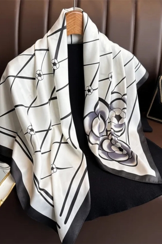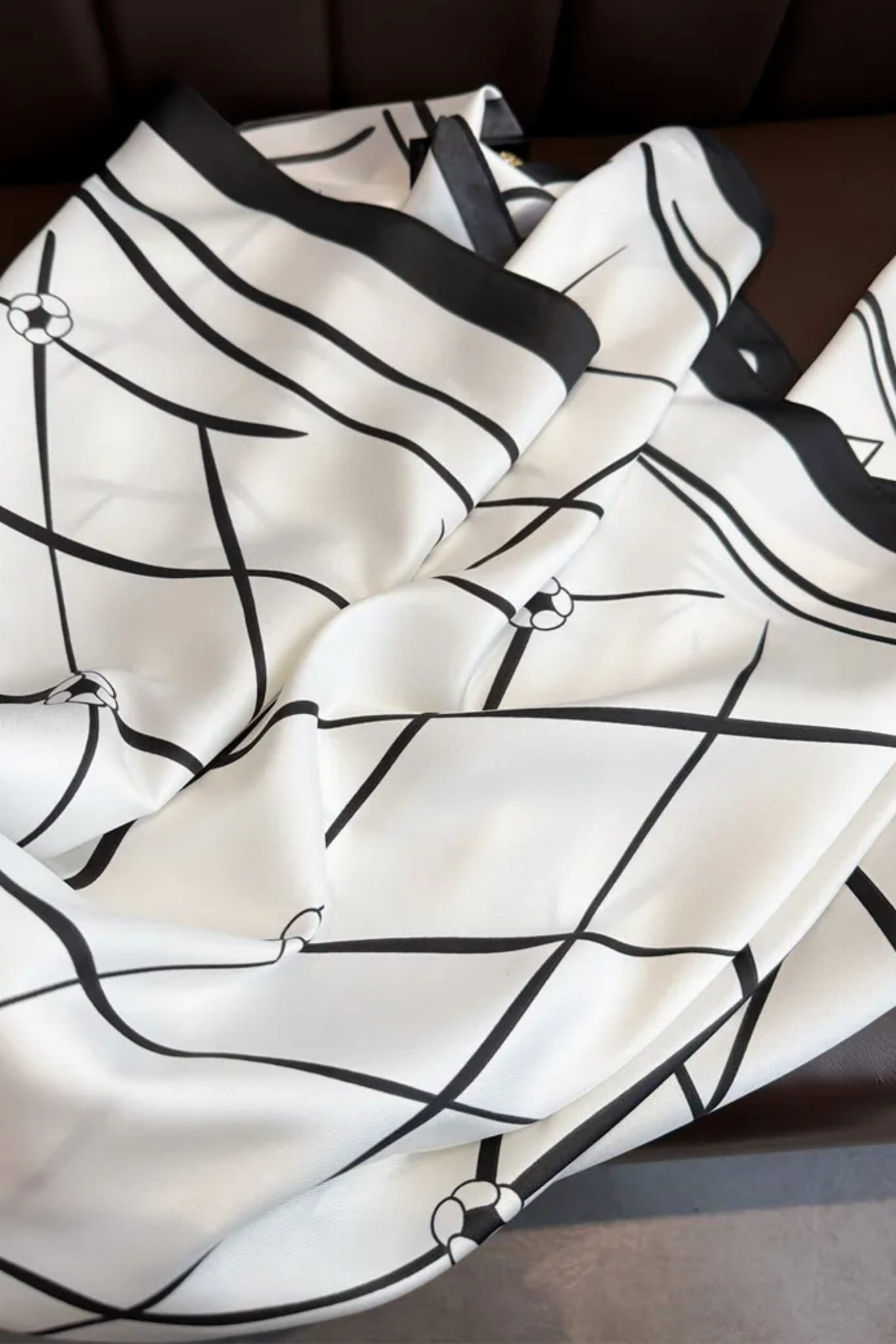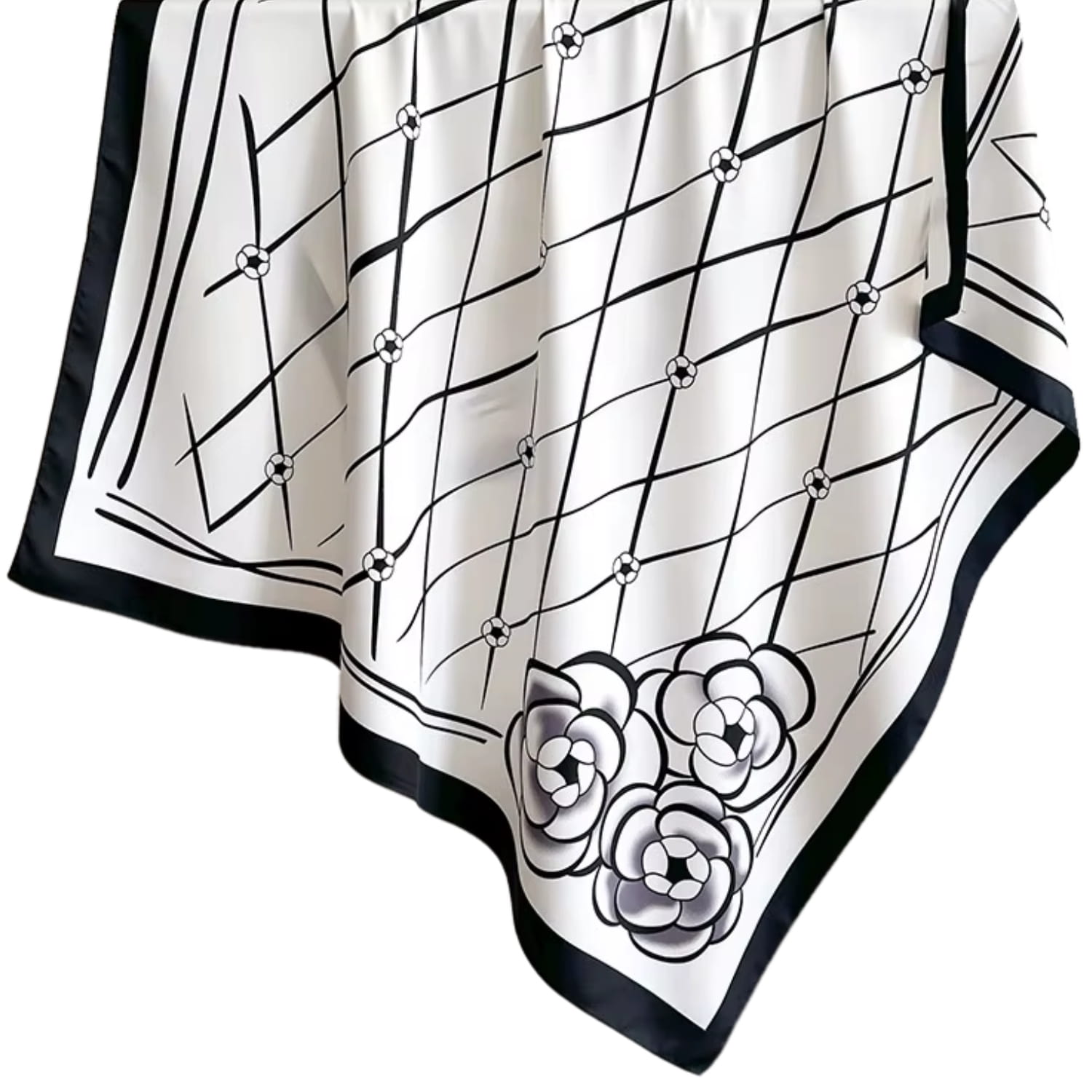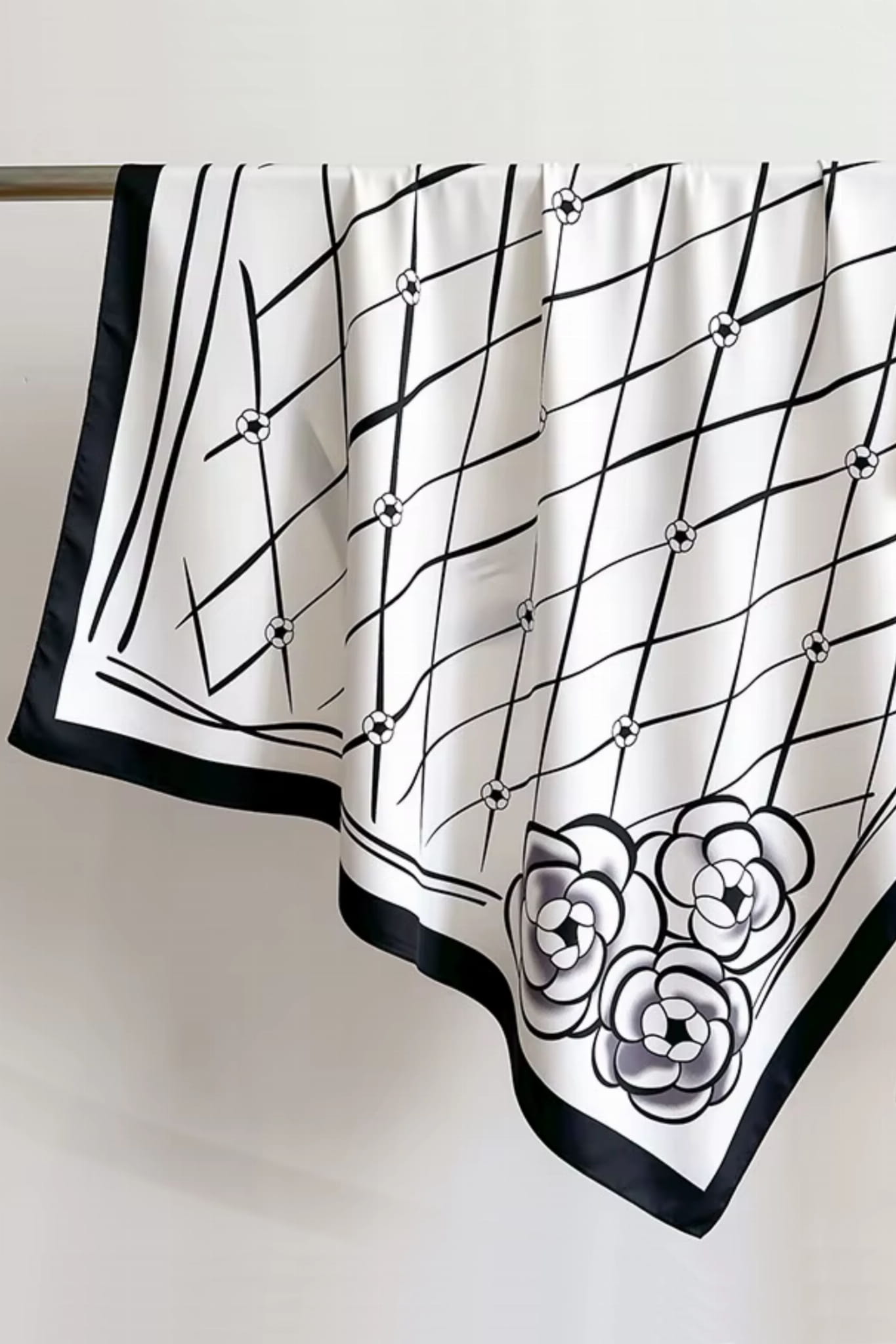 Stylowa apaszka 90x90 cm w klasycznej czerni i bieli. Geometryczna siatka i kwiatowy akcent tworzą wyjątkowo elegancki wzór. Wykonana z delikatnej imitacji jedwabiu.