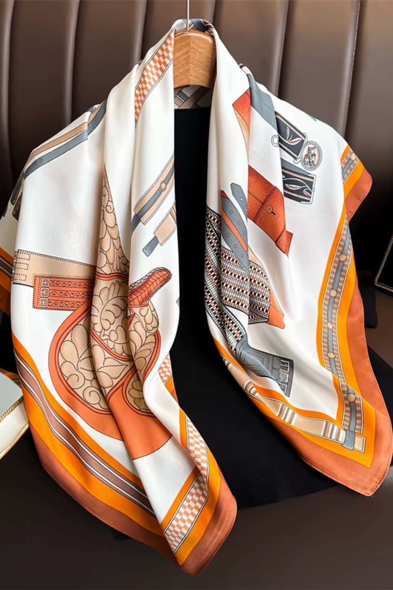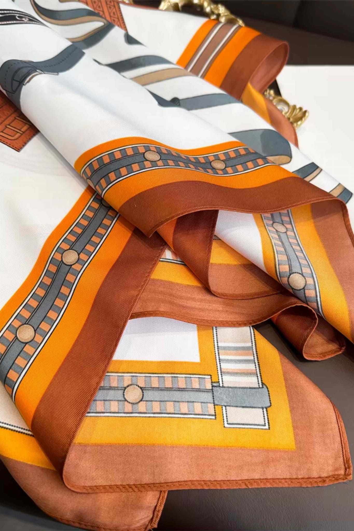 Stylowa apaszka „Jeździecki Styl” to propozycja dla kobiet ceniących klasykę i subtelną ekstrawagancję. Wzór inspirowany motywami jeździeckimi – siodłami, paskami i uprzężami – nadaje całości charakteru rodem z luksusowych stajni.