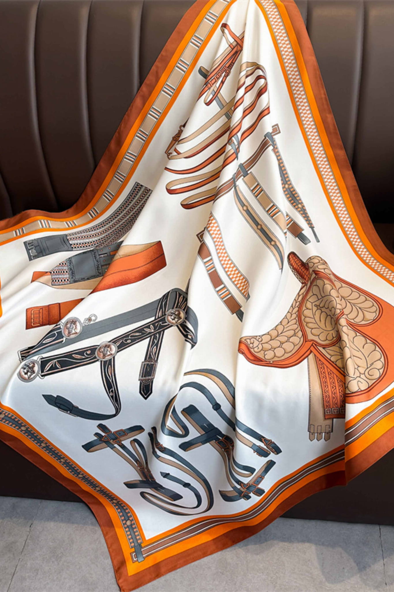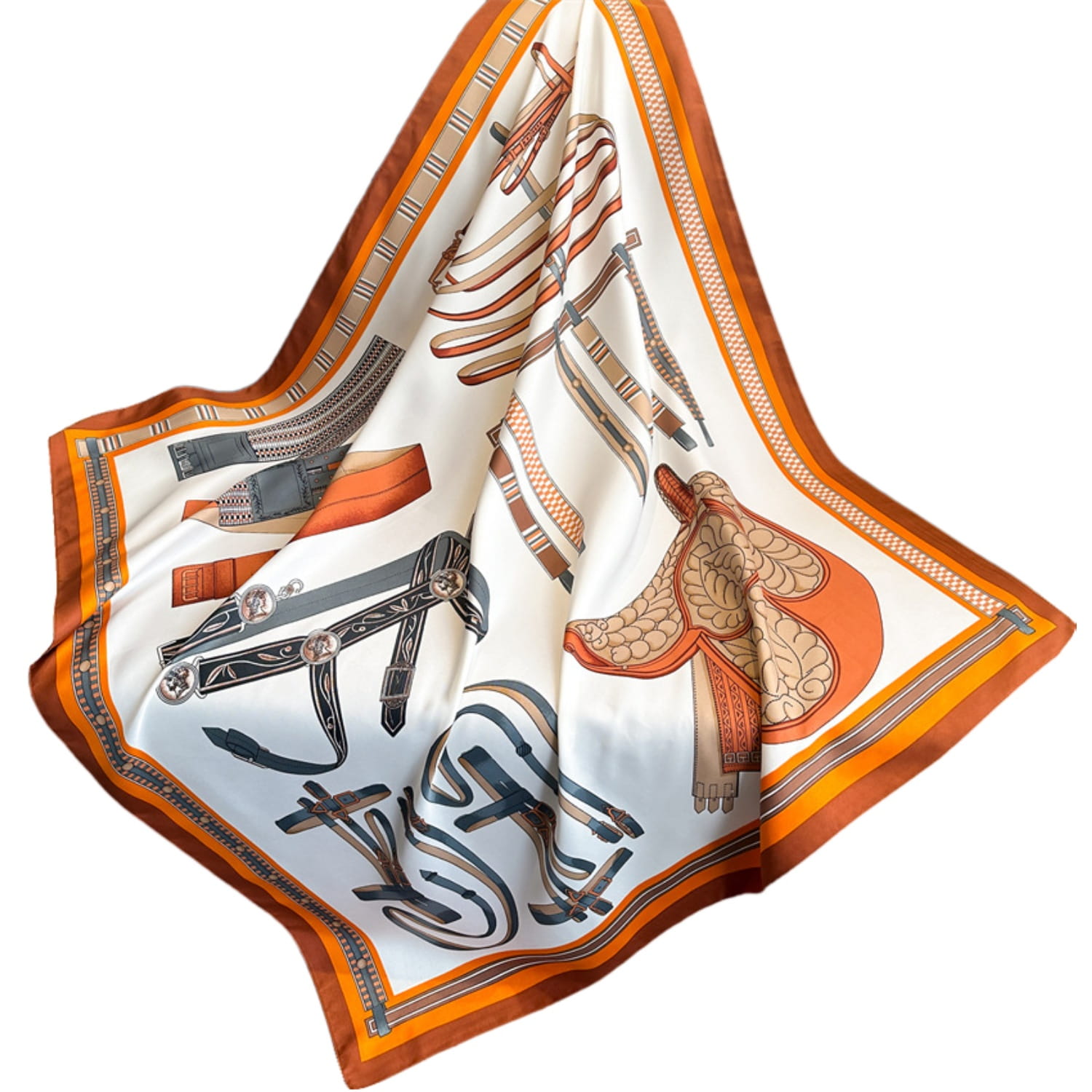 Apaszka 90x90 cm z motywem siodeł, uzd i pasków. Inspirowana stylem jeździeckim. Wykonana z tkaniny imitującej jedwab.