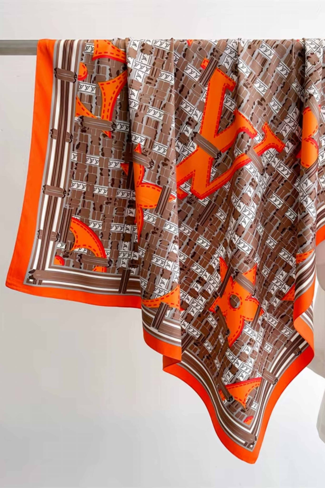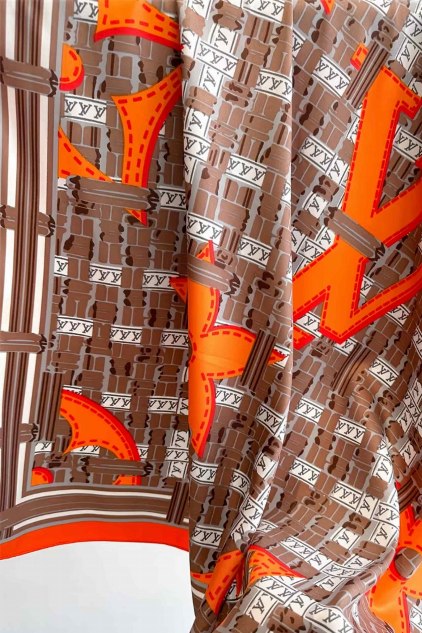 Ta apaszka 90x90 cm to manifest koloru i wzoru. Na tle brązowo-beżowej struktury urbanistycznej wyróżniają się wyraziste motywy geometryczne w odcieniach pomarańczy i czerwieni. Całość dopełnia kontrastująca pomarańczowa ramka, która dodaje charakteru.