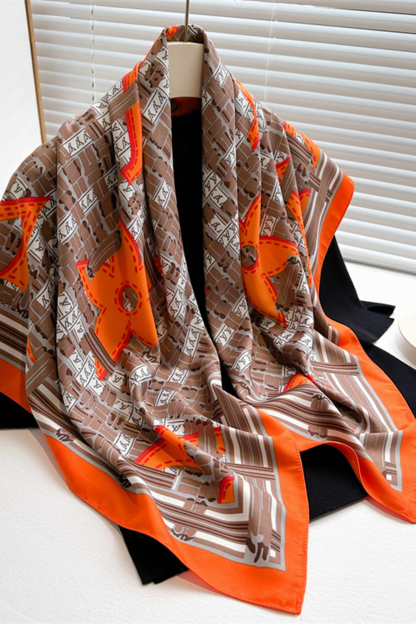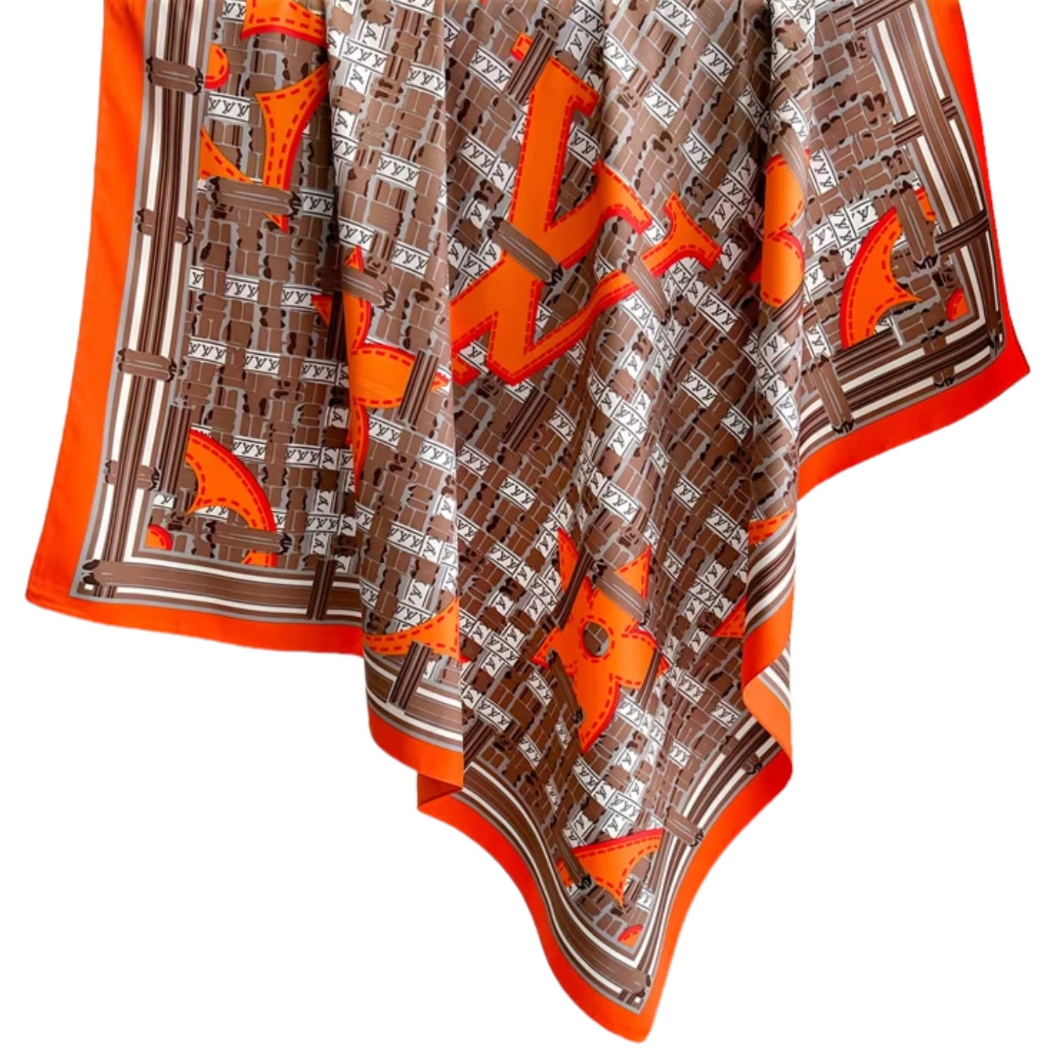 Apaszka 90x90 cm z pomarańczowo-brązowym wzorem geometrycznym – artystyczna, wyrazista i lekka jak jedwab.