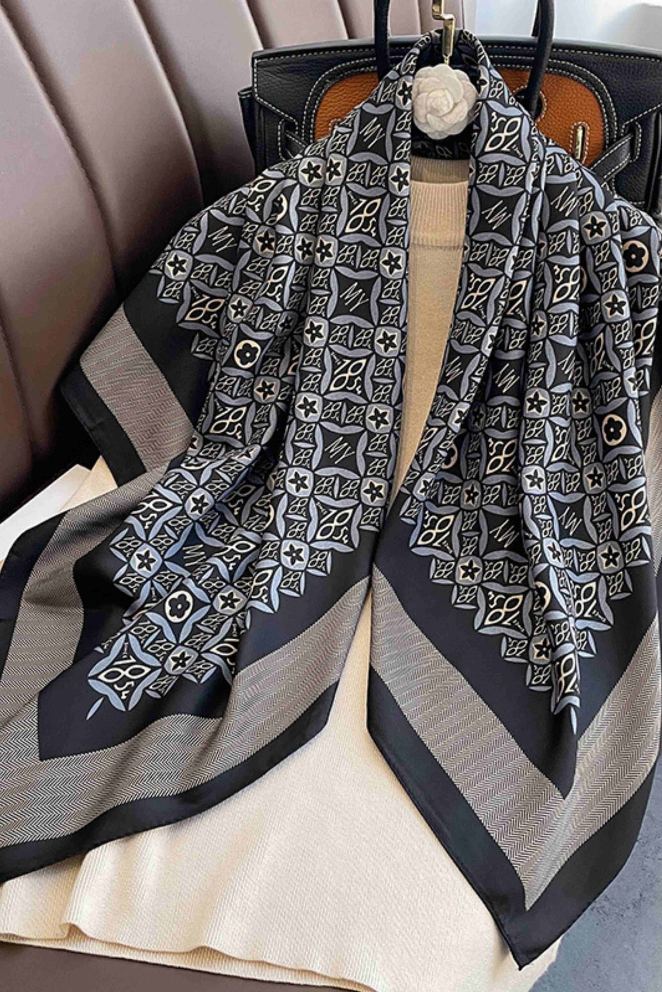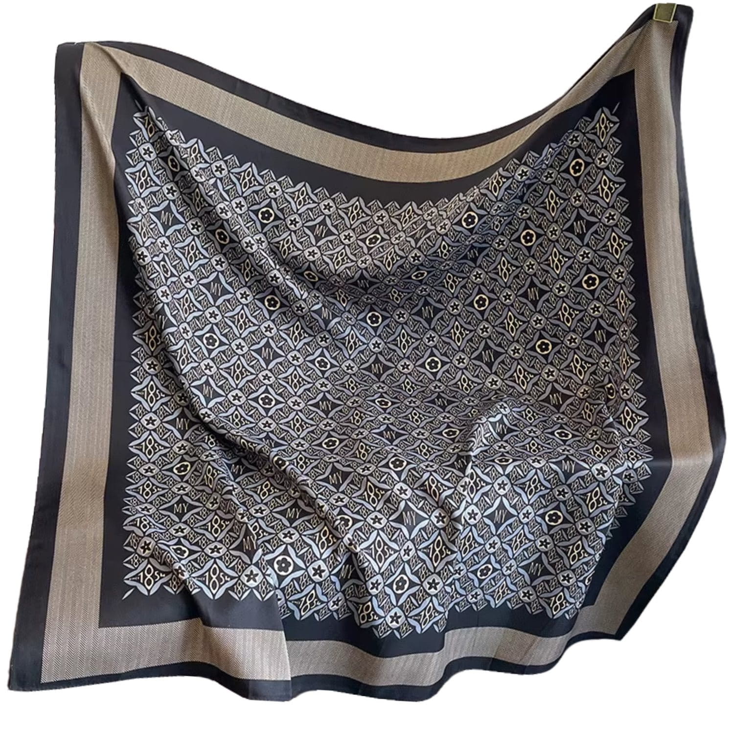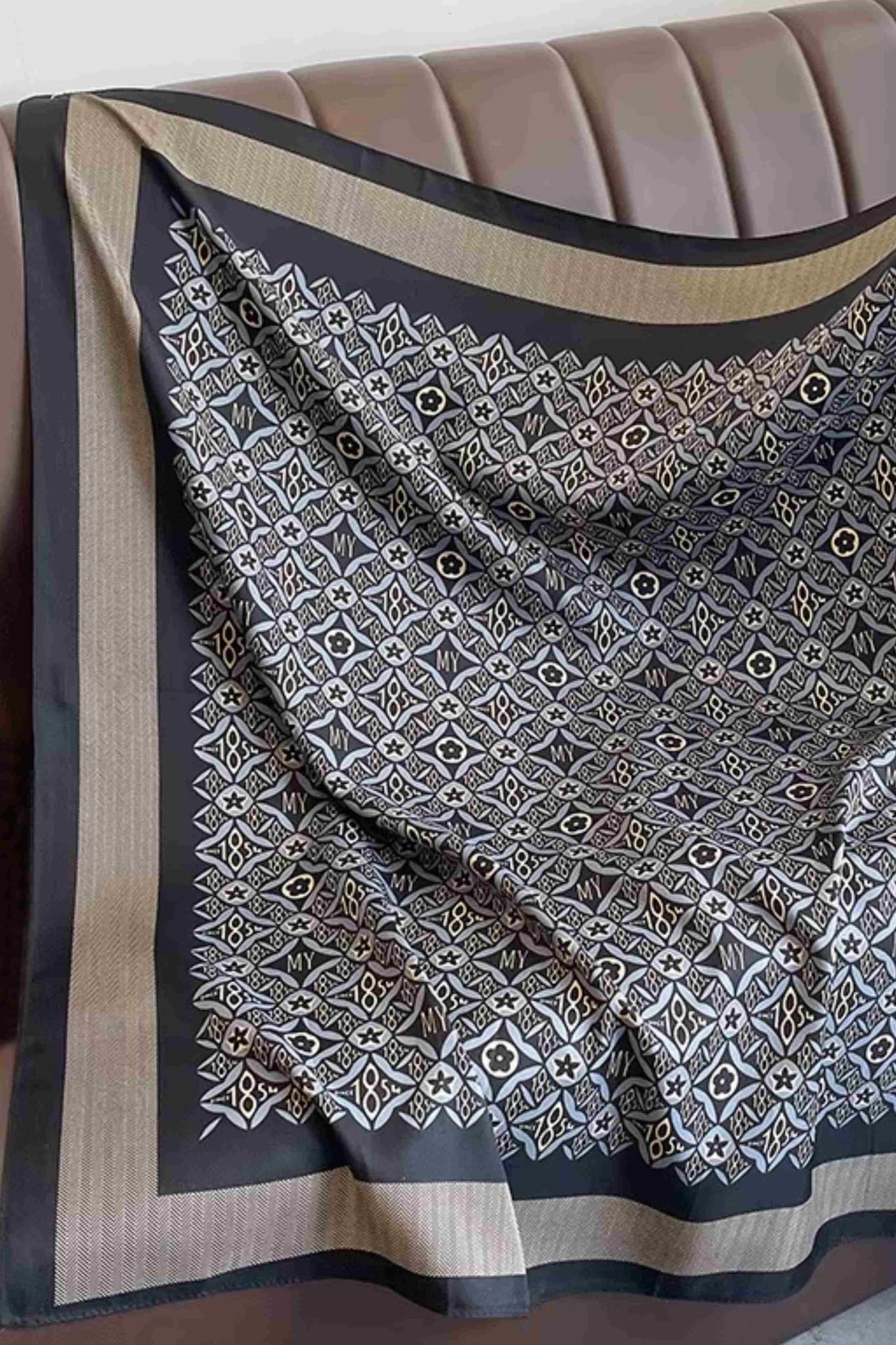 Ta apaszka damska 90x90 cm to kwintesencja elegancji, która nigdy nie wychodzi z mody. Czarno-szary wzór o geometrycznym charakterze, przypominający luksusowe mozaiki i stylowe detale, został otoczony subtelnym obramowaniem w jodełkę i zakończony ciemną ramką, która nadaje całości wyjątkowej głębi.