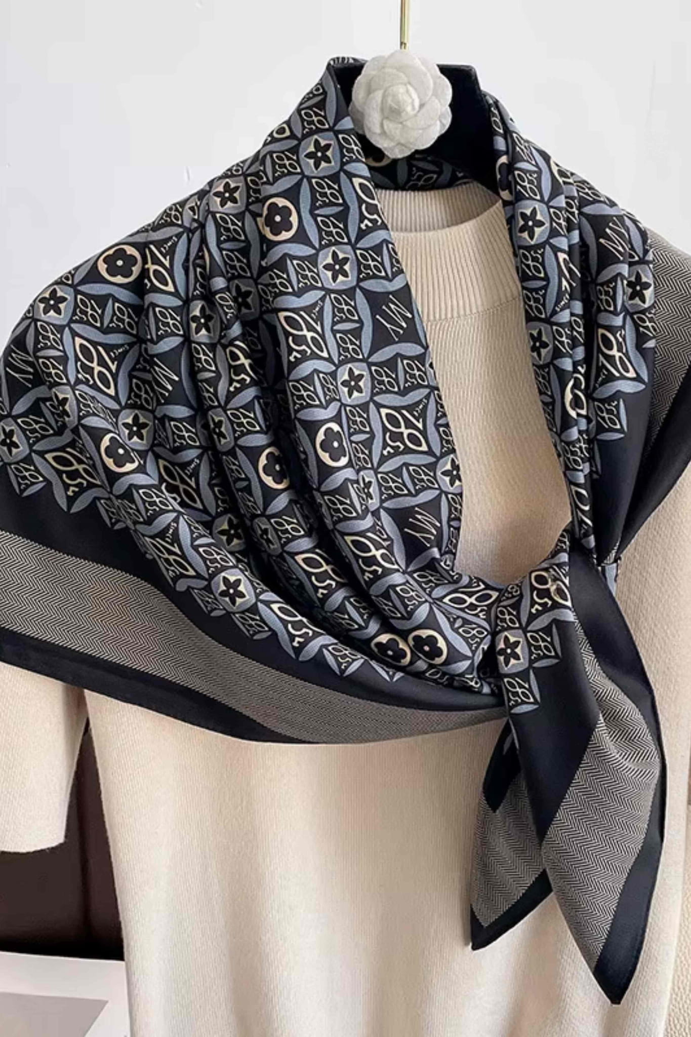 Apaszka damska 90x90 – klasyczna harmonia w czerni i szarości