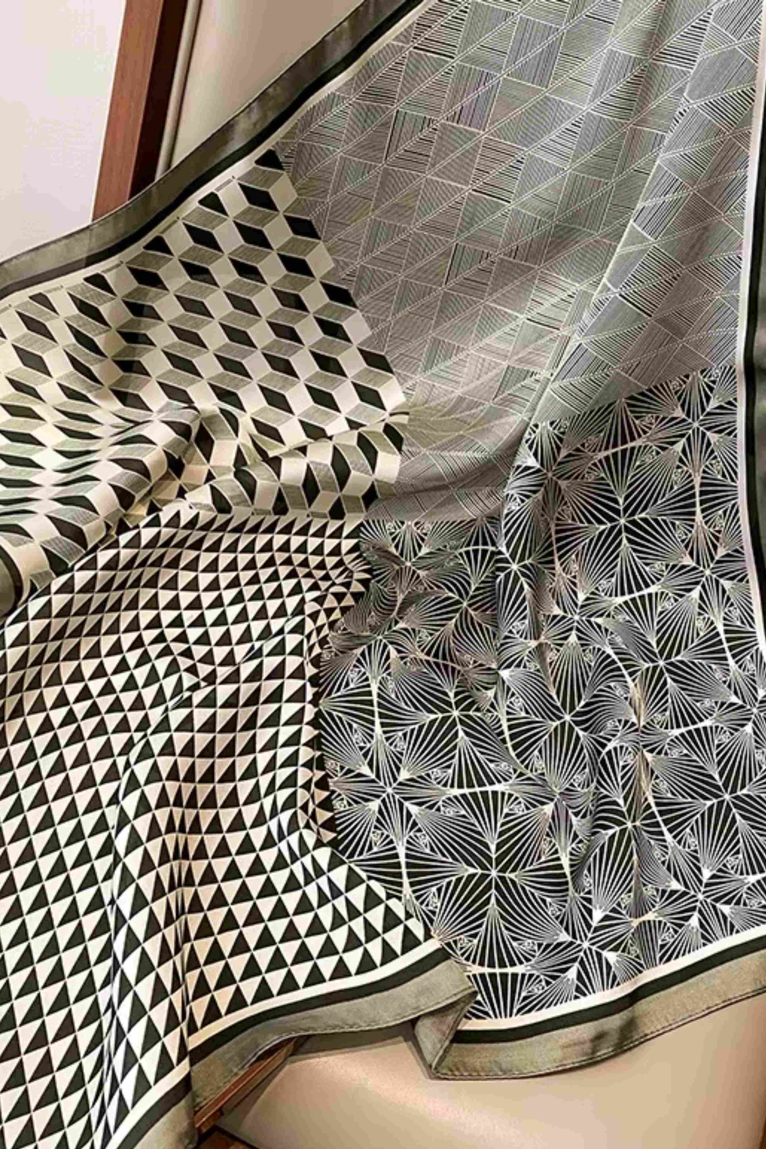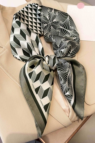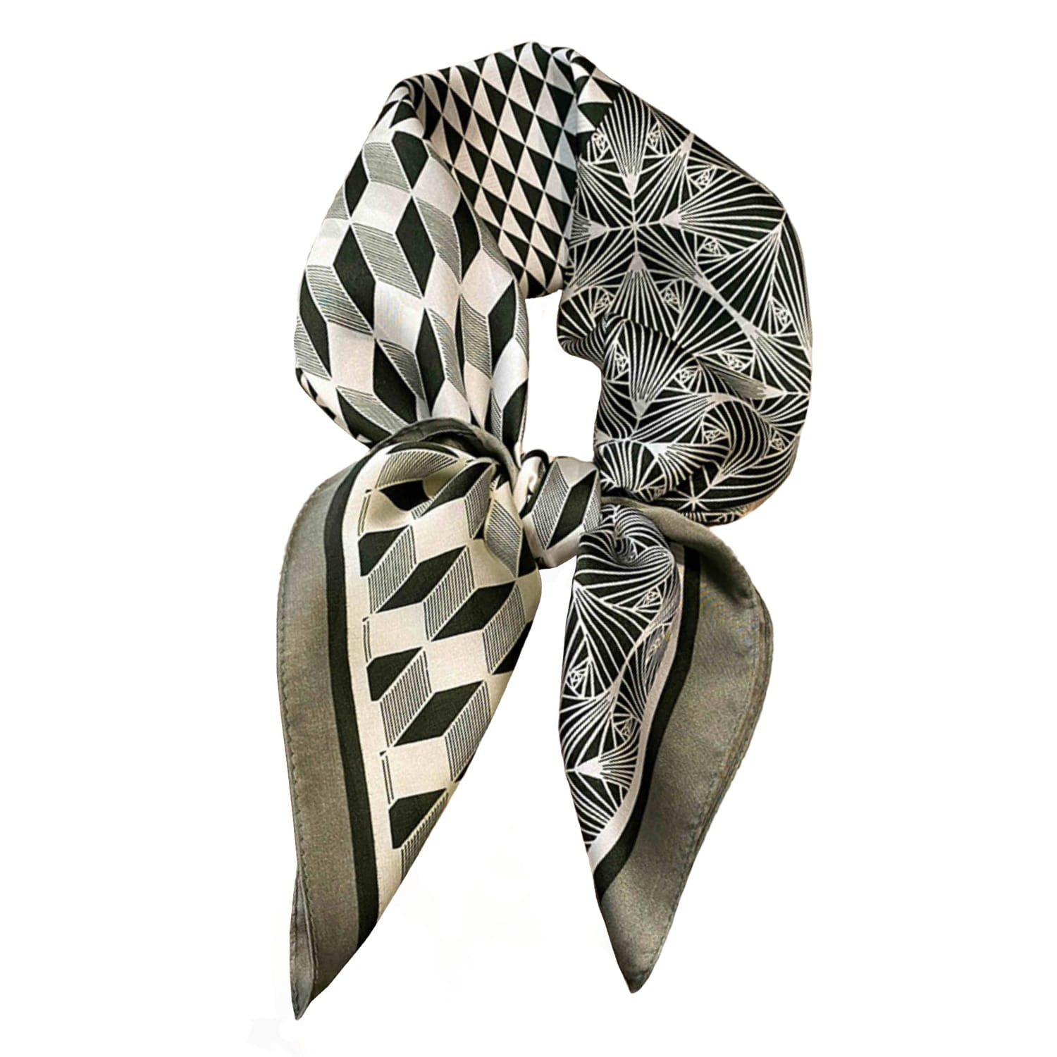 Apaszka 70x70 cm w odcieniach oliwkowej zieleni i beżu z geometrycznym i roślinnym wzorem. Jedwabista, lekka, idealna do miejskich stylizacji.