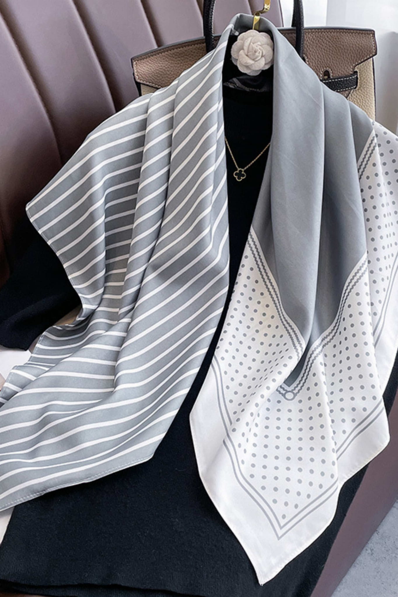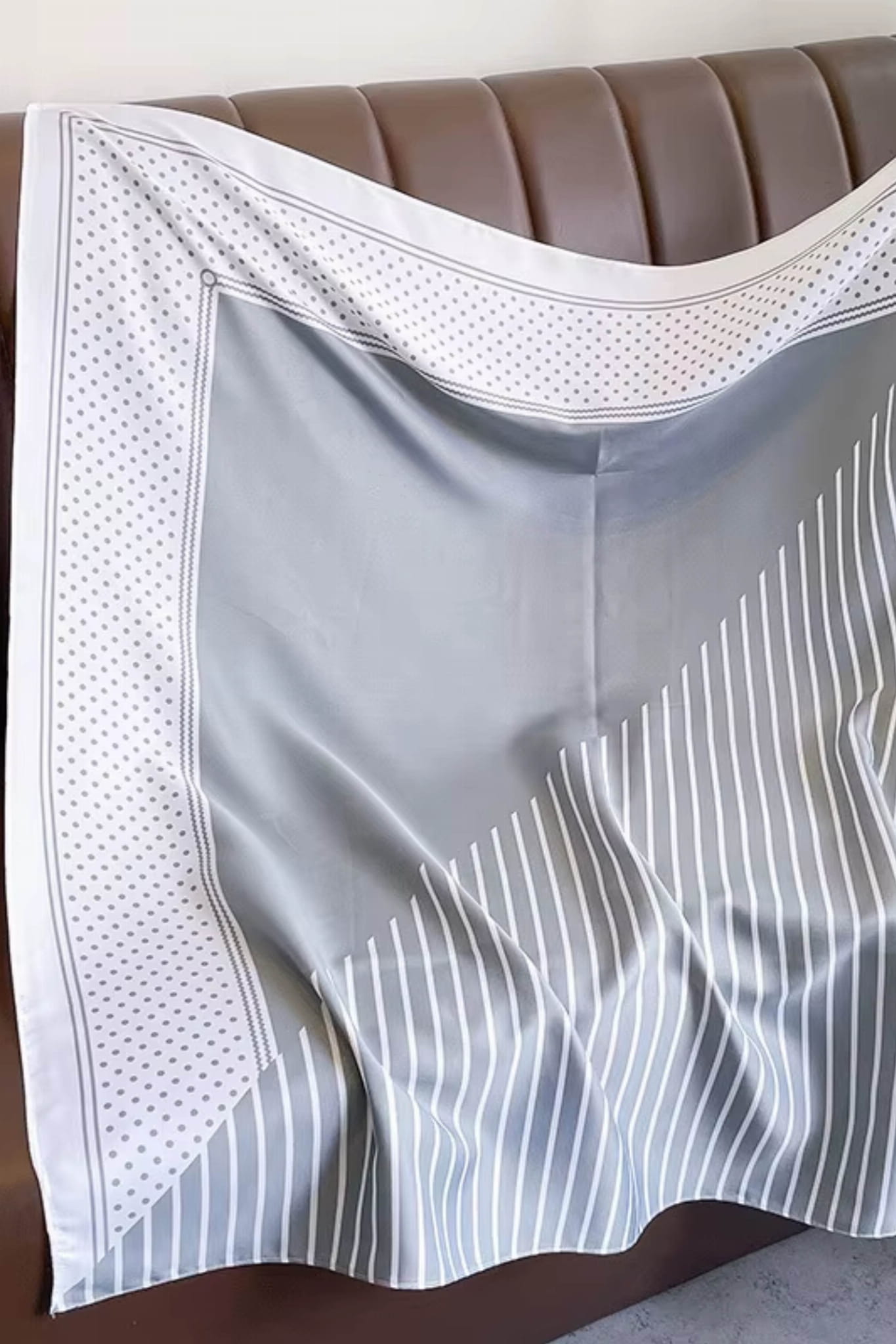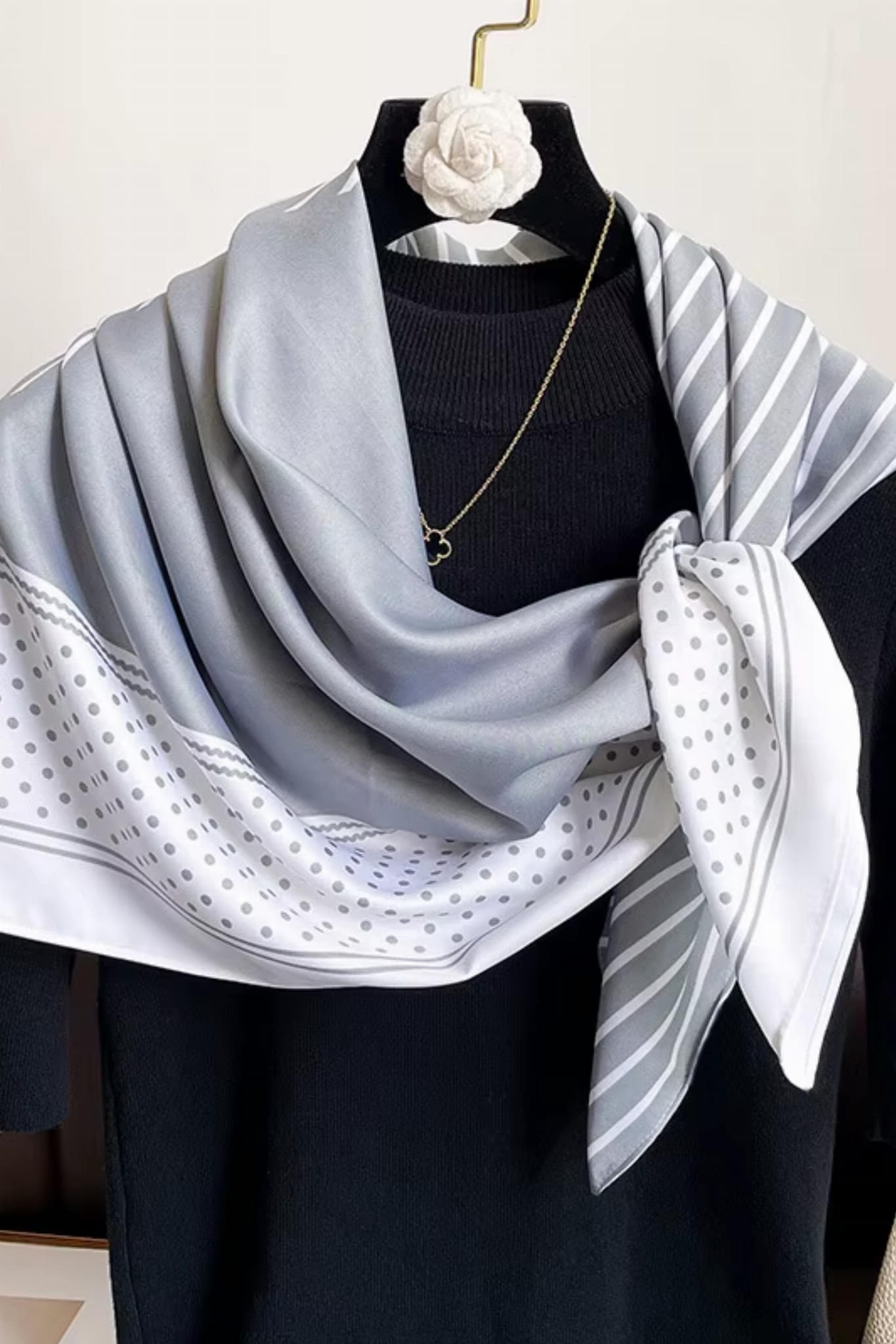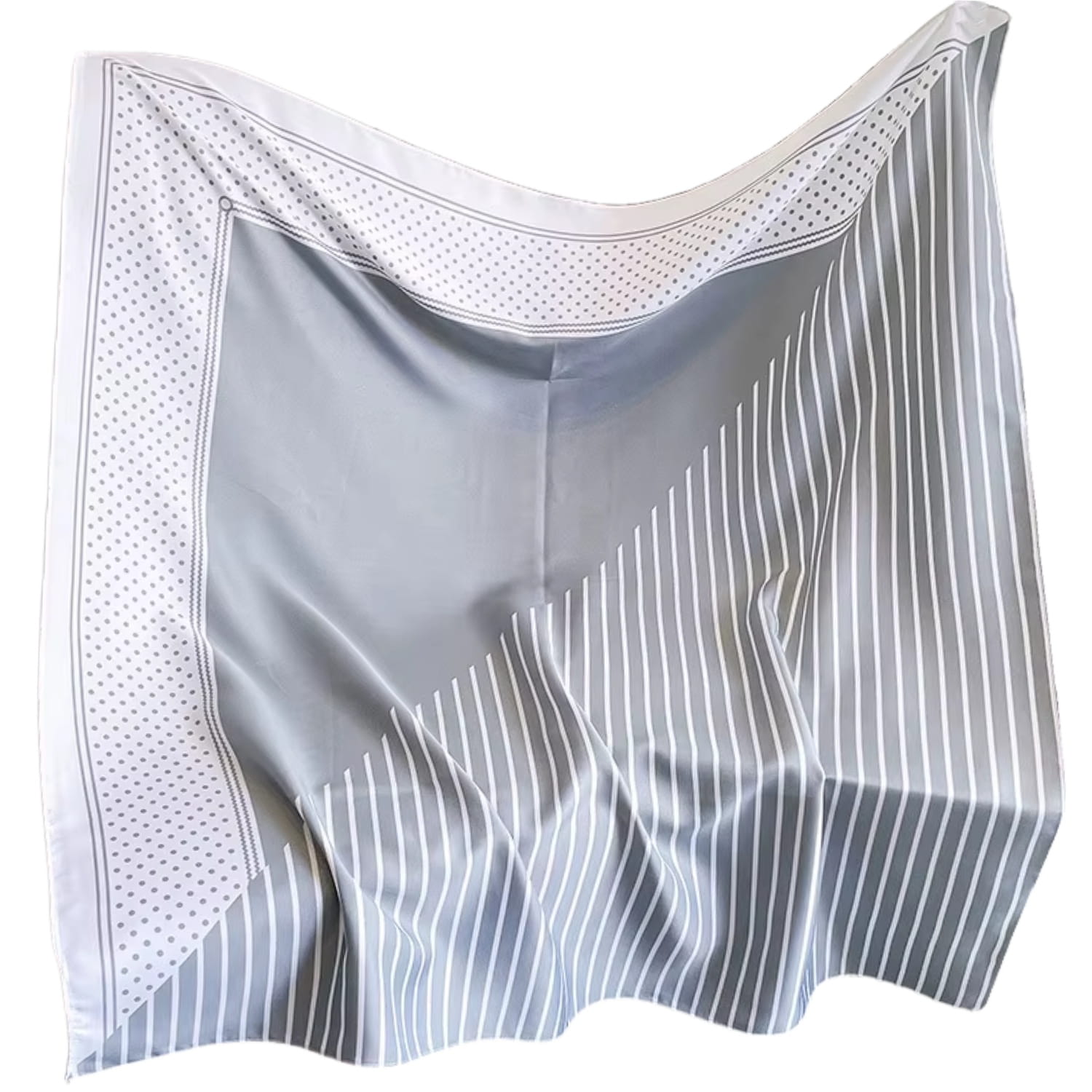 Apaszka 90x90 cm w szaro-białych tonach z pasami i groszkami – subtelna, elegancka, jedwabista w dotyku.