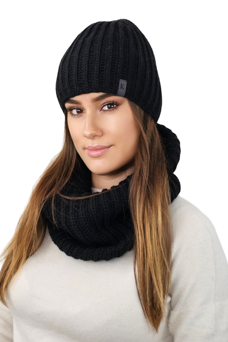 CYKORIA zimowy komplet czapka z kominem w gruby prążek kolor czarny