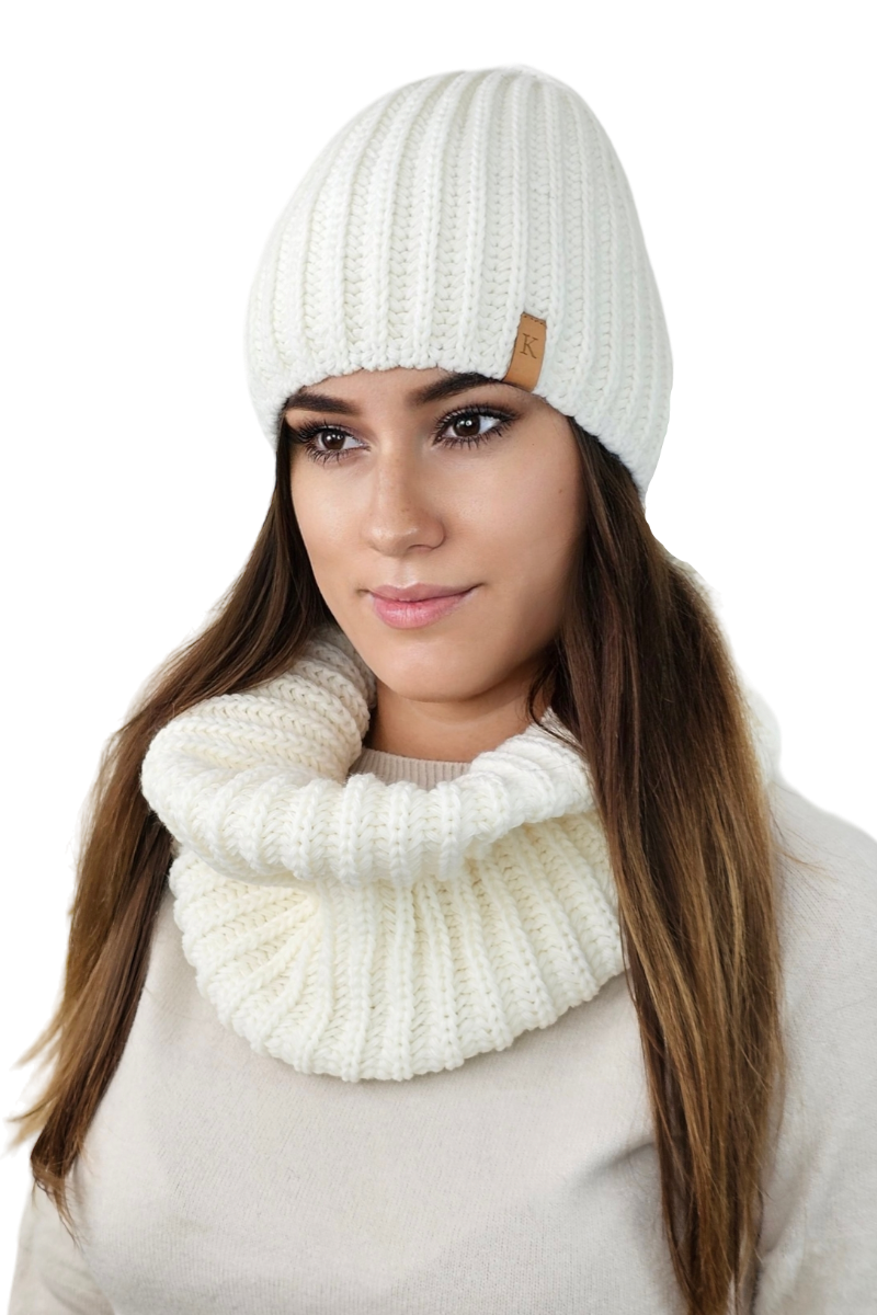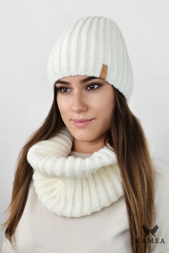 CYKORIA zimowy komplet czapka z kominem w gruby prążek kolor ekru