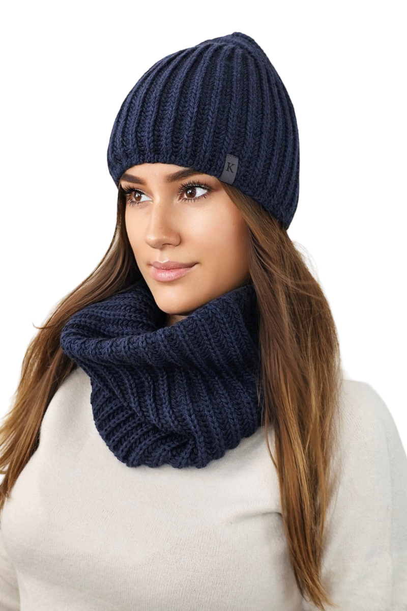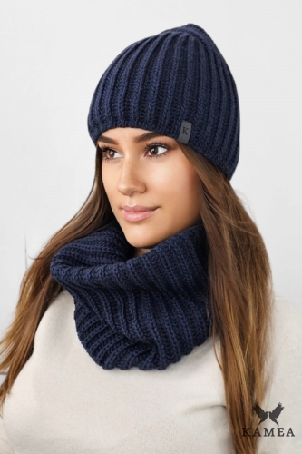CYKORIA zimowy komplet czapka z kominem w gruby prążek kolor granatowy