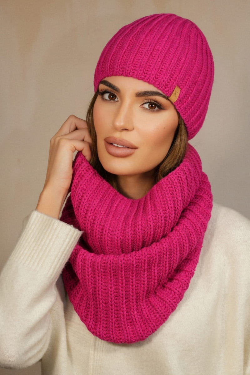 CYKORIA zimowy komplet czapka z kominem w gruby prążek kolor malinowy