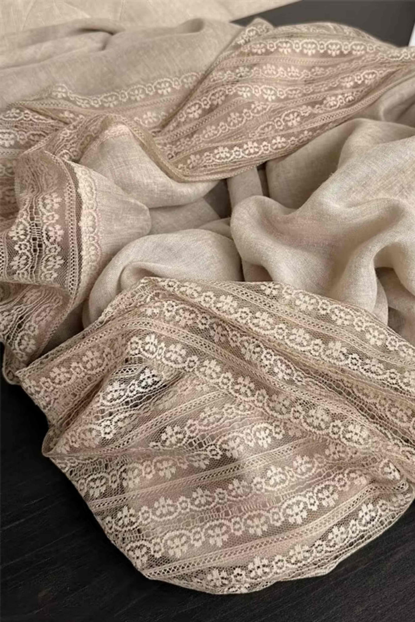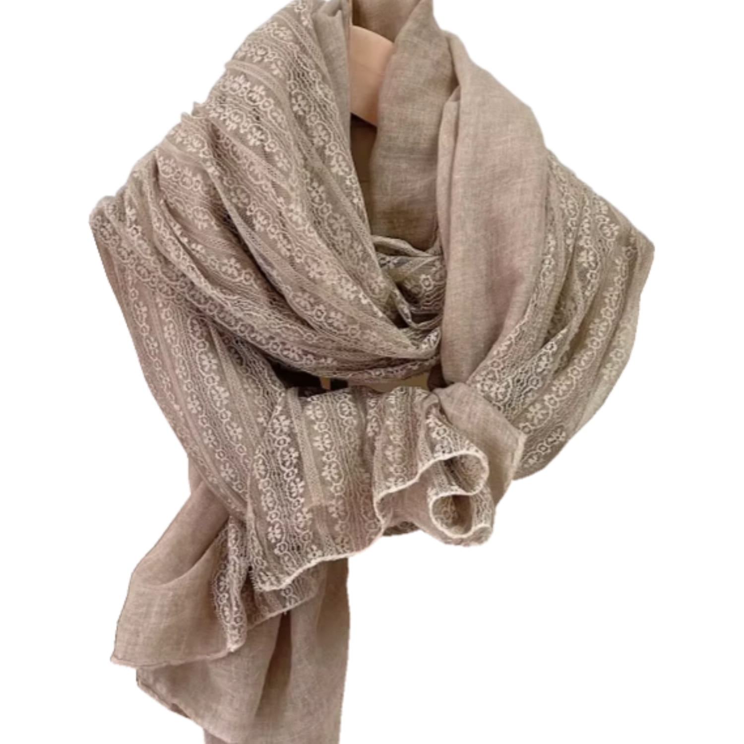 Ciemnobeżowy szal z koronką 180x90 cm – bawełna z poliestrem