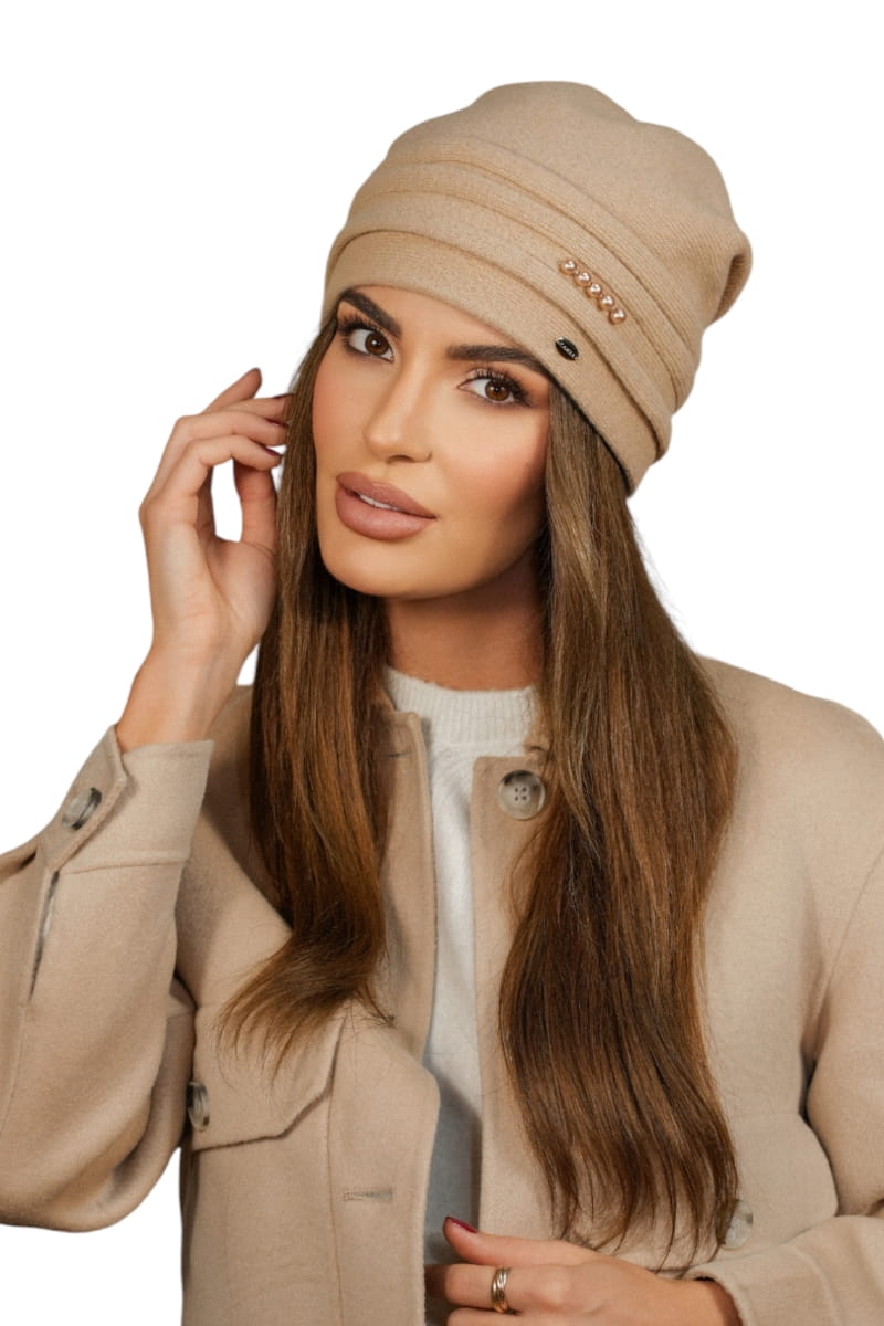 Czapka Damska Wełniana Ozdobiona Koralami Kolor Camel Kamea-Sakura
