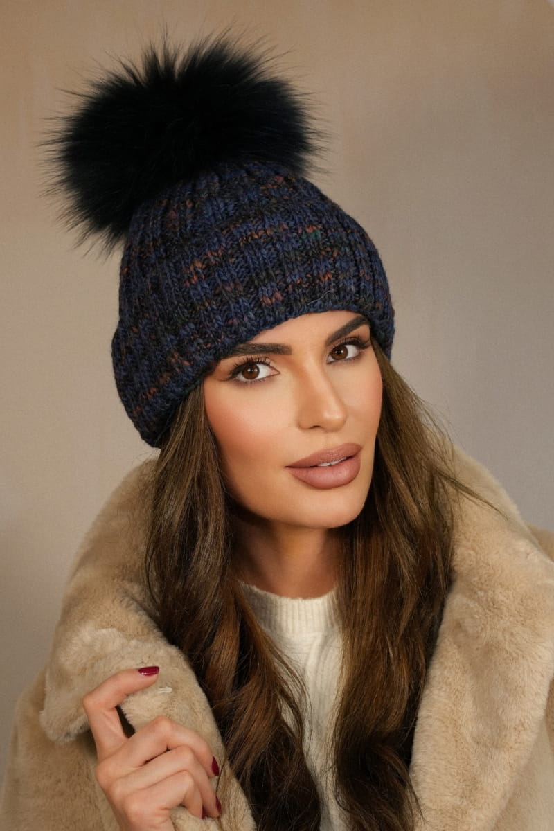 Czapka Wielokolorowa Kolor Granatowy Kamea-Pavone Z Naturalnym Pomponem Z Yenota