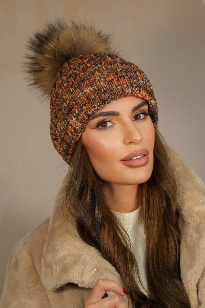 Czapka Wielokolorowa Kolor Rudy Kamea-Pavone Z Naturalnym Pomponem Z Yenota