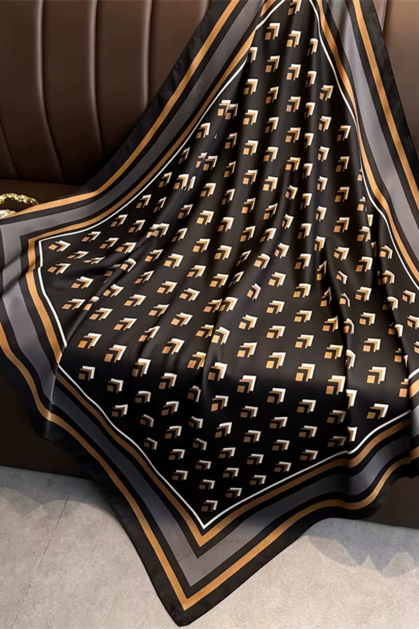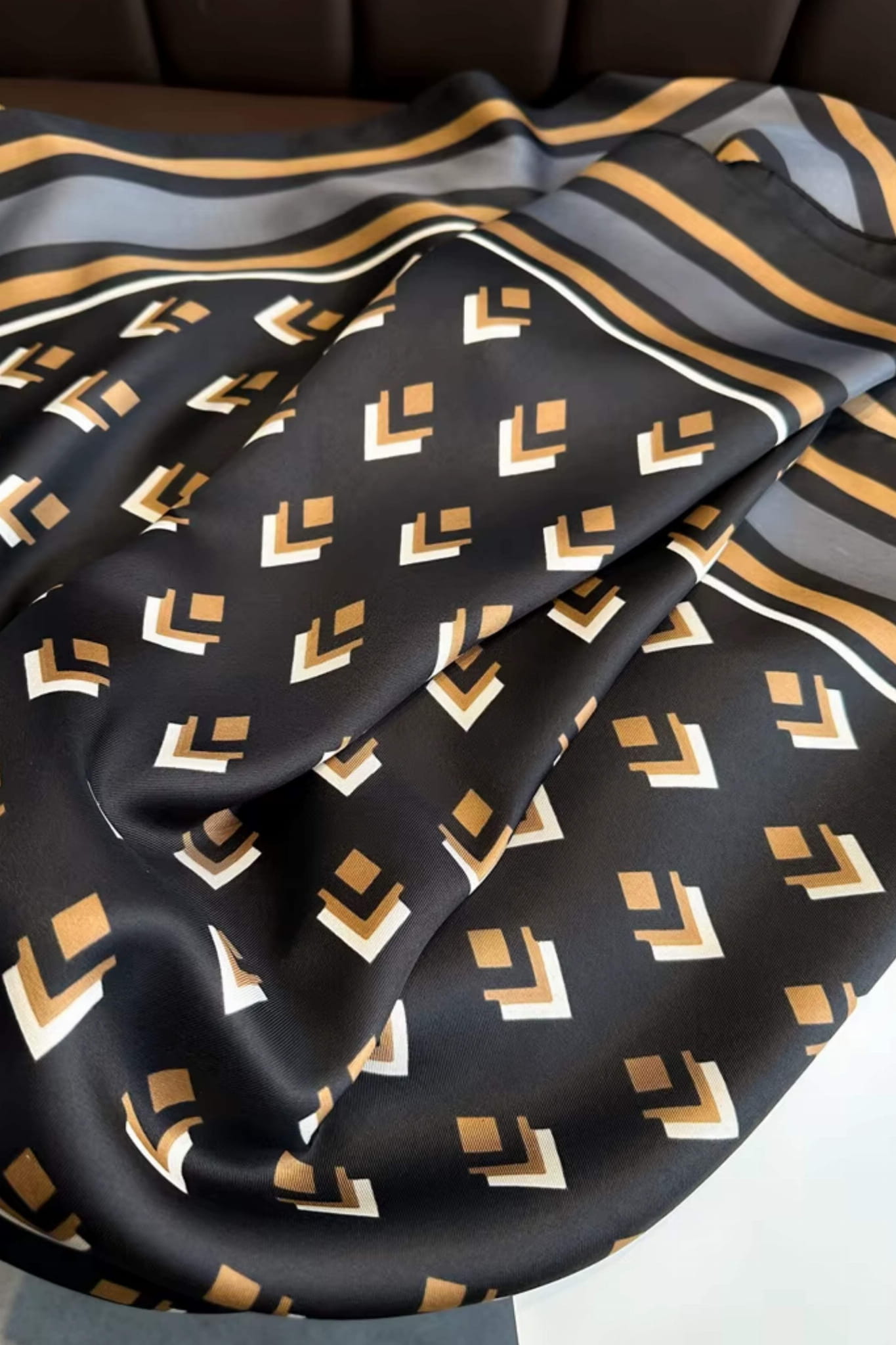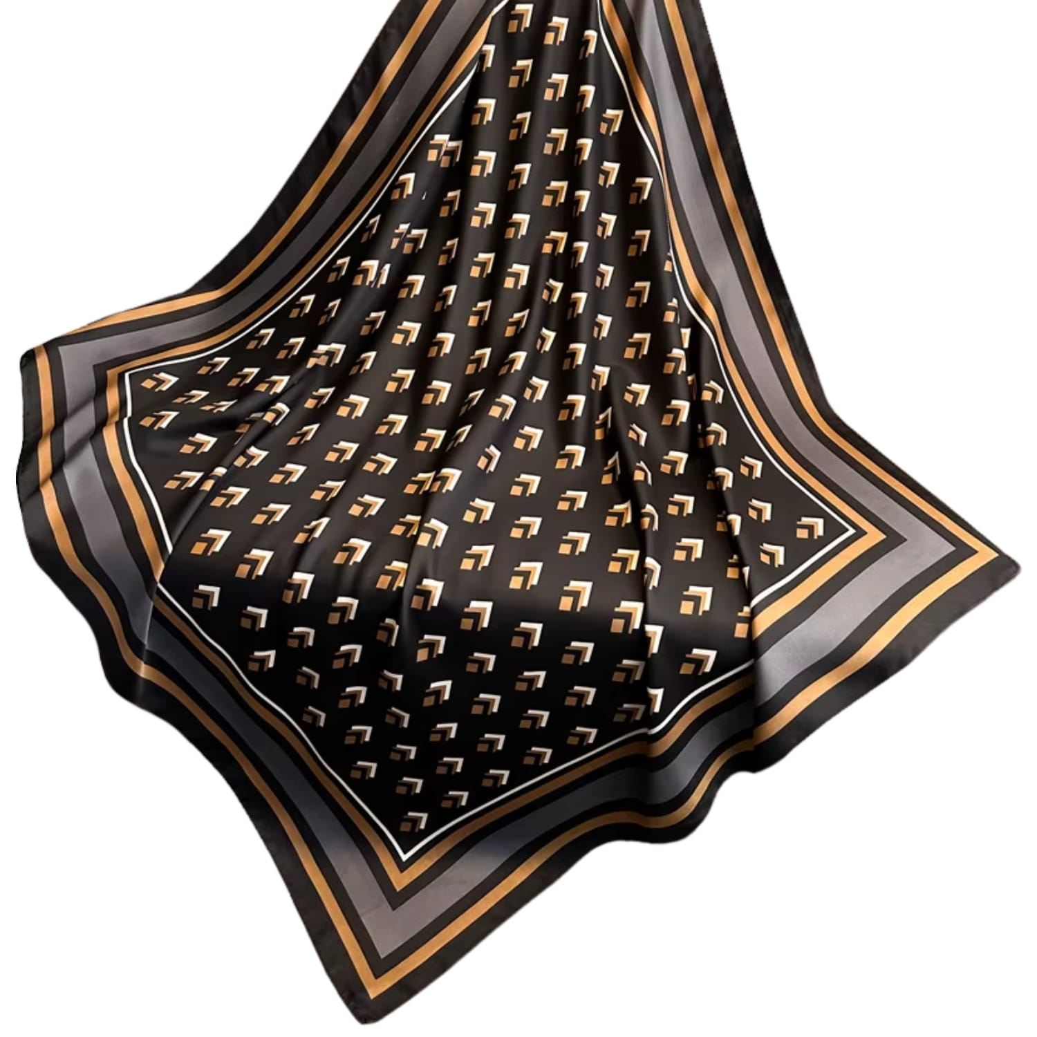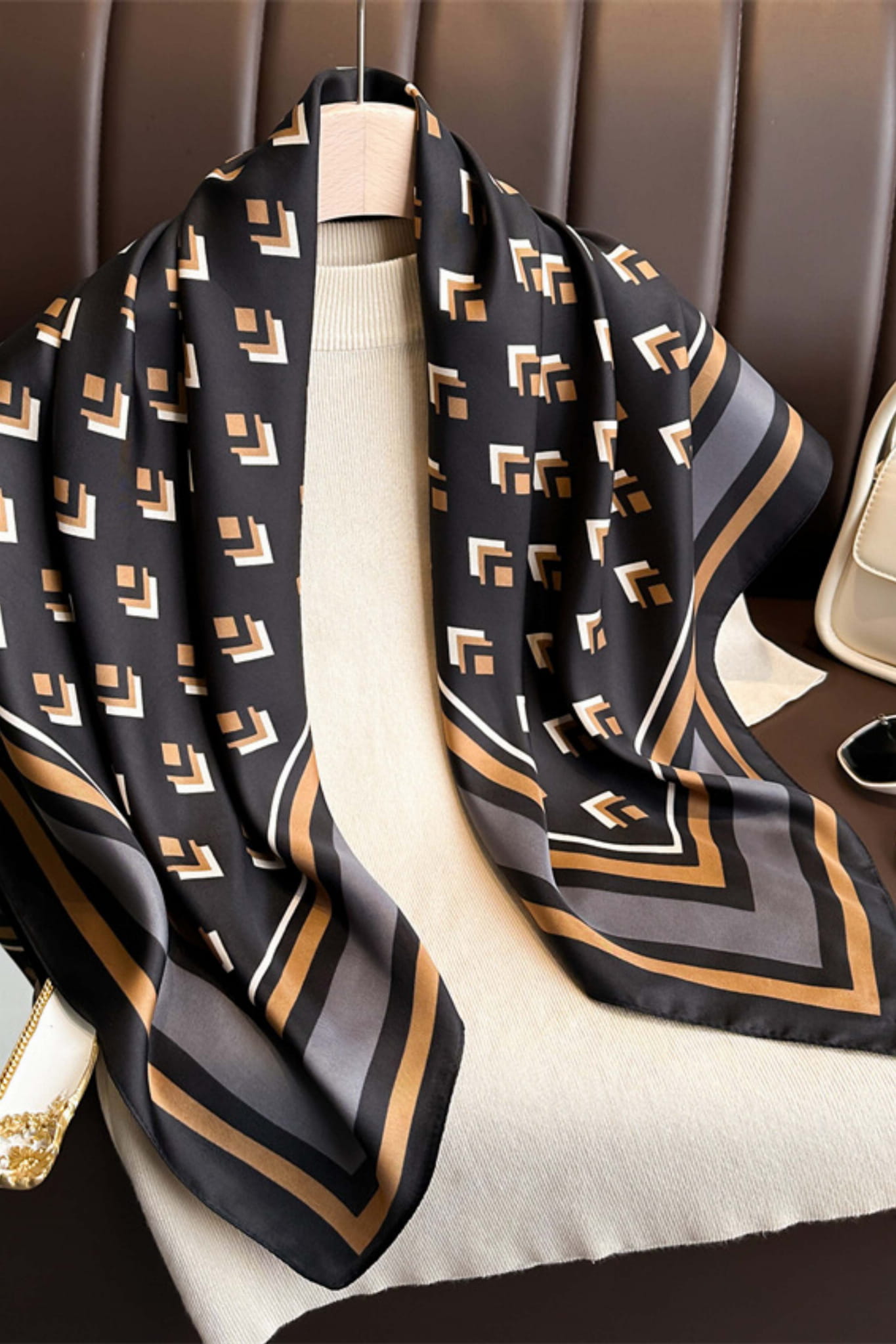 Nowoczesna apaszka 90x90 z geometrycznym wzorem w beżu i karmelu na tle głębokiej czerni – idealna do codziennych i eleganckich stylizacji.