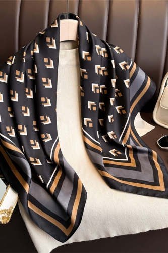 Czarna apaszka 90x90 z geometrycznym wzorem w odcieniach beżu i karmelu – nowoczesna elegancja