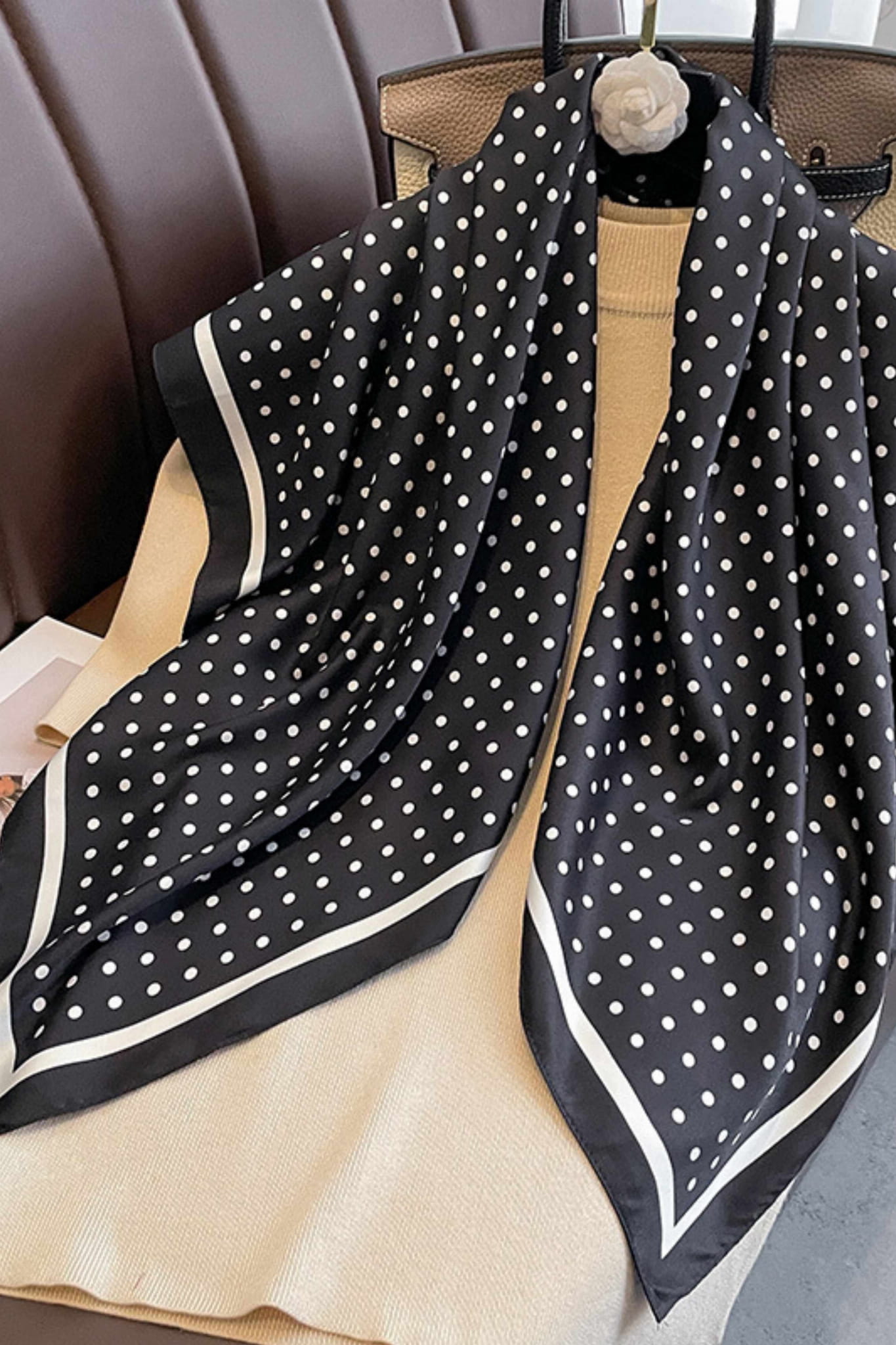 Beżowa apaszka w czarne groszki 90x90 – elegancja retro i nowoczesna lekkość