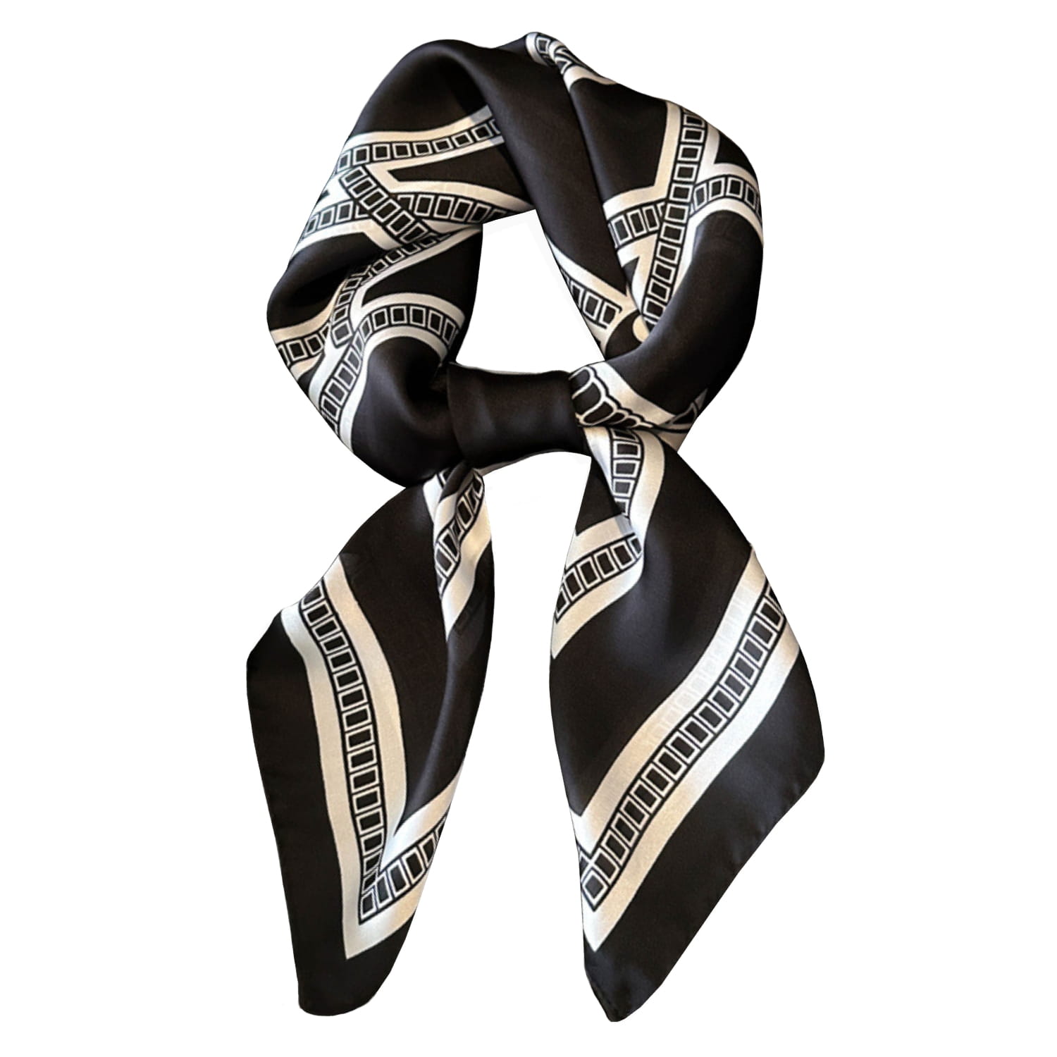 Elegancka apaszka 70x70 cm w czarno-białej kolorystyce z geometrycznym wzorem – klasyka i szyk w jednym.