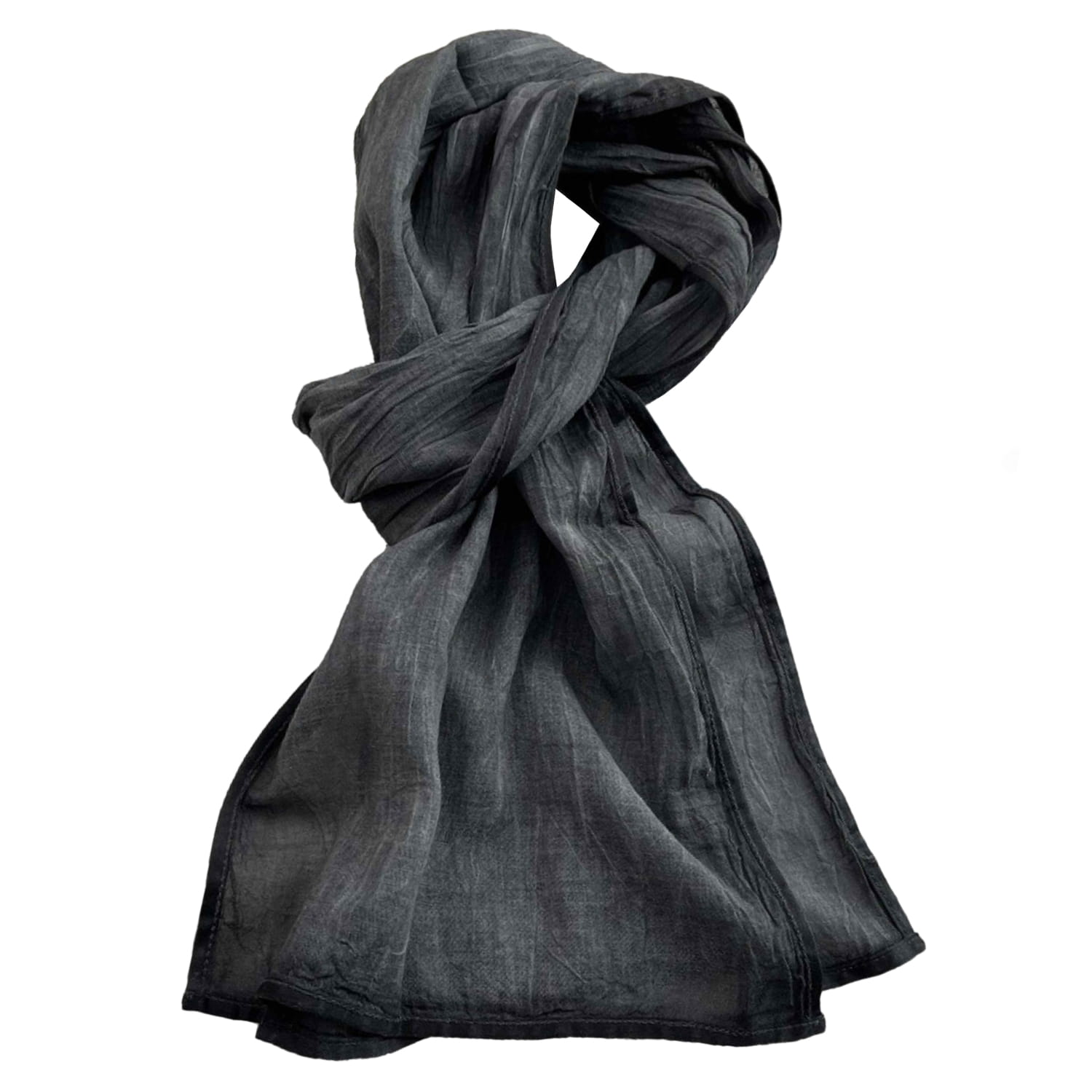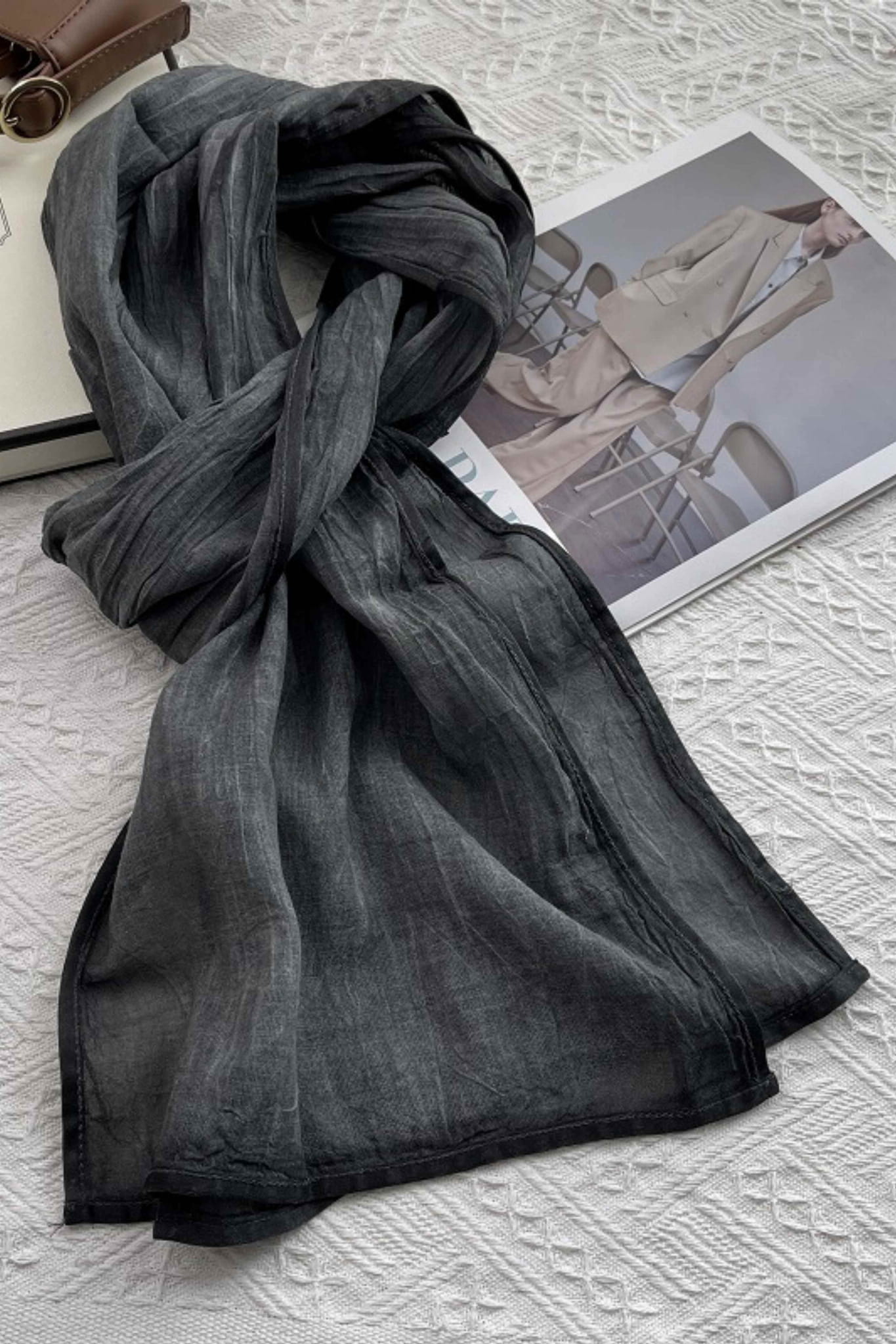 Stylowy i uniwersalny czarny szalik z lekkiej, przewiewnej bawełny. Dzięki subtelnej przezroczystości i delikatnej strukturze materiału, świetnie układa się na szyi i ramionach, dodając stylizacji eleganckiego charakteru.