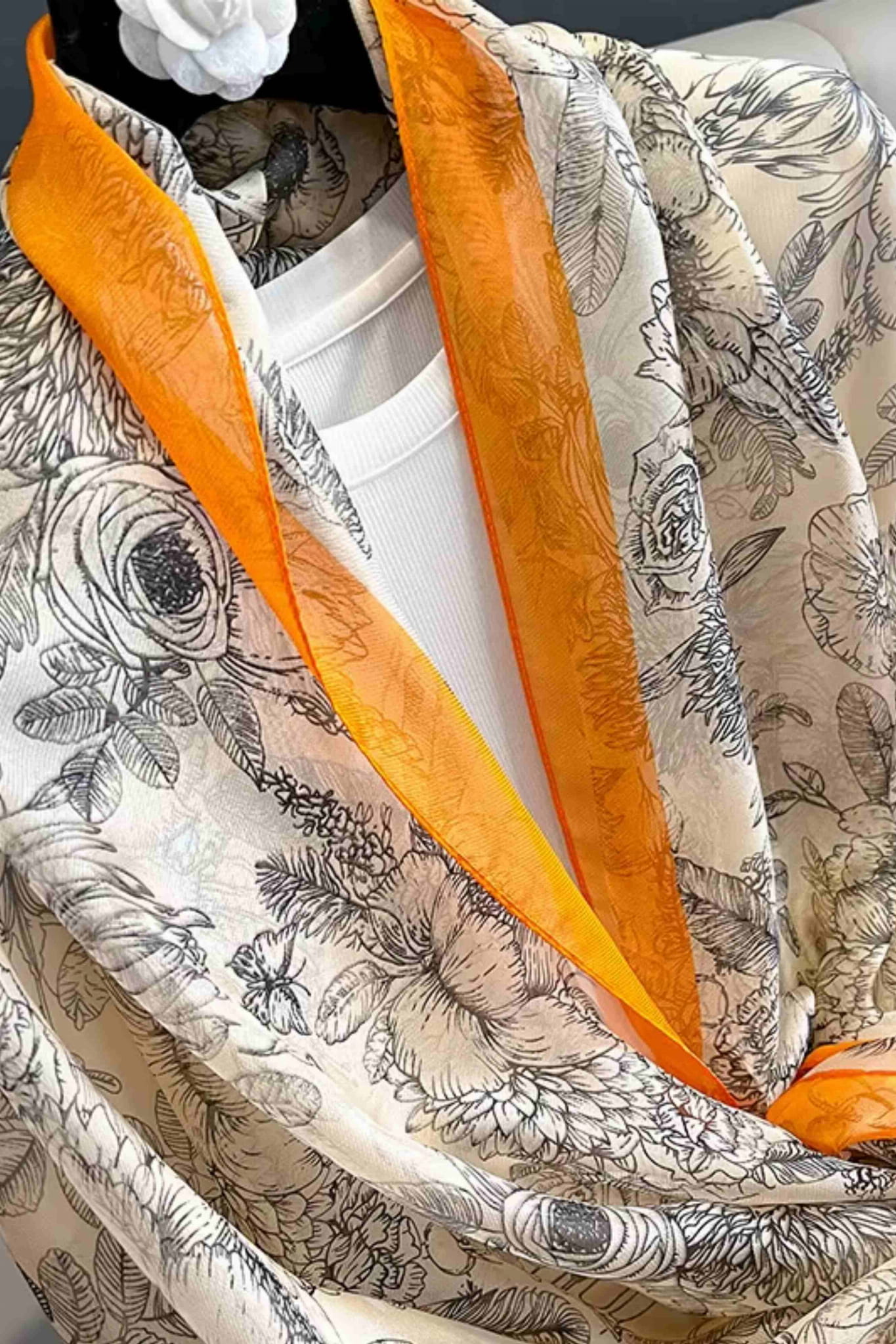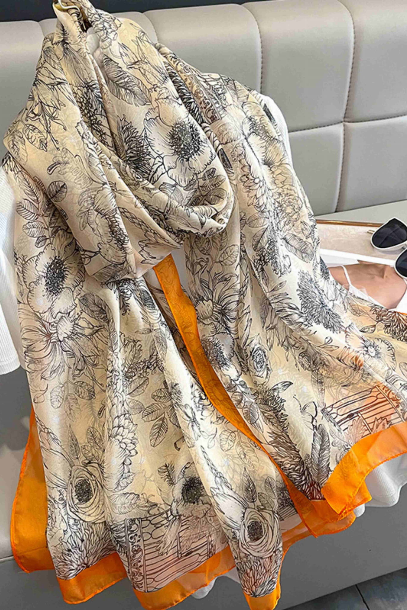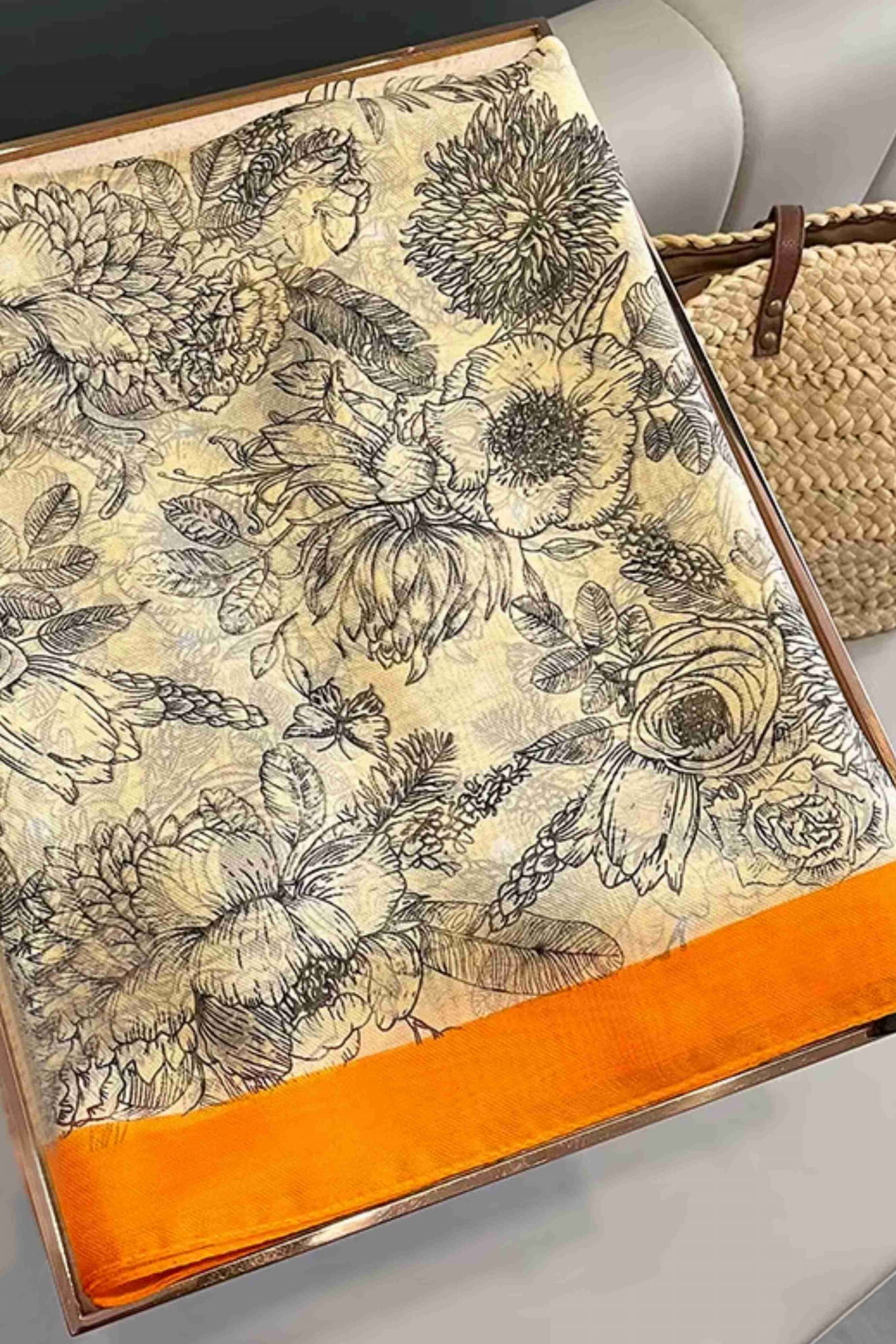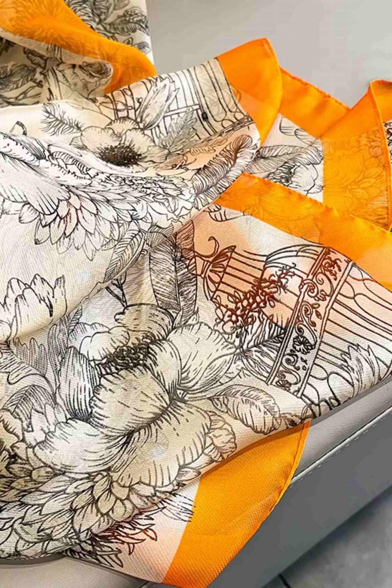 Botaniczny szal z pomarańczową ramką – klasyczna elegancja w nowoczesnym wydaniu
