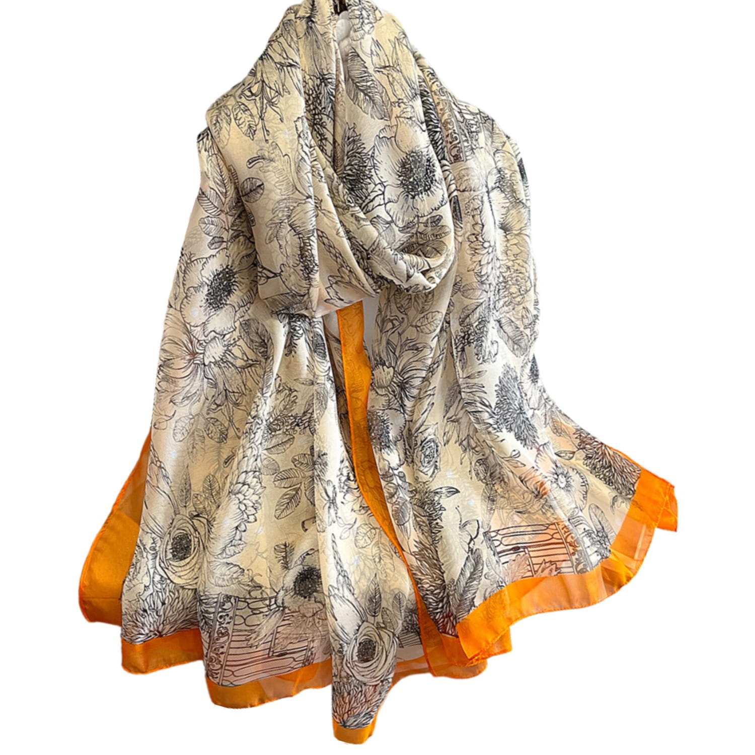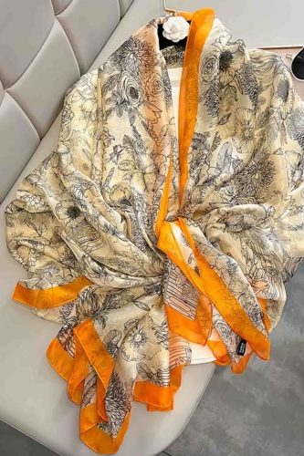 Stylowy szal z delikatnym, roślinnym nadrukiem i kontrastującą pomarańczową ramką. Idealny do eleganckich i codziennych stylizacji – lekki, kobiecy, ponadczasowy.