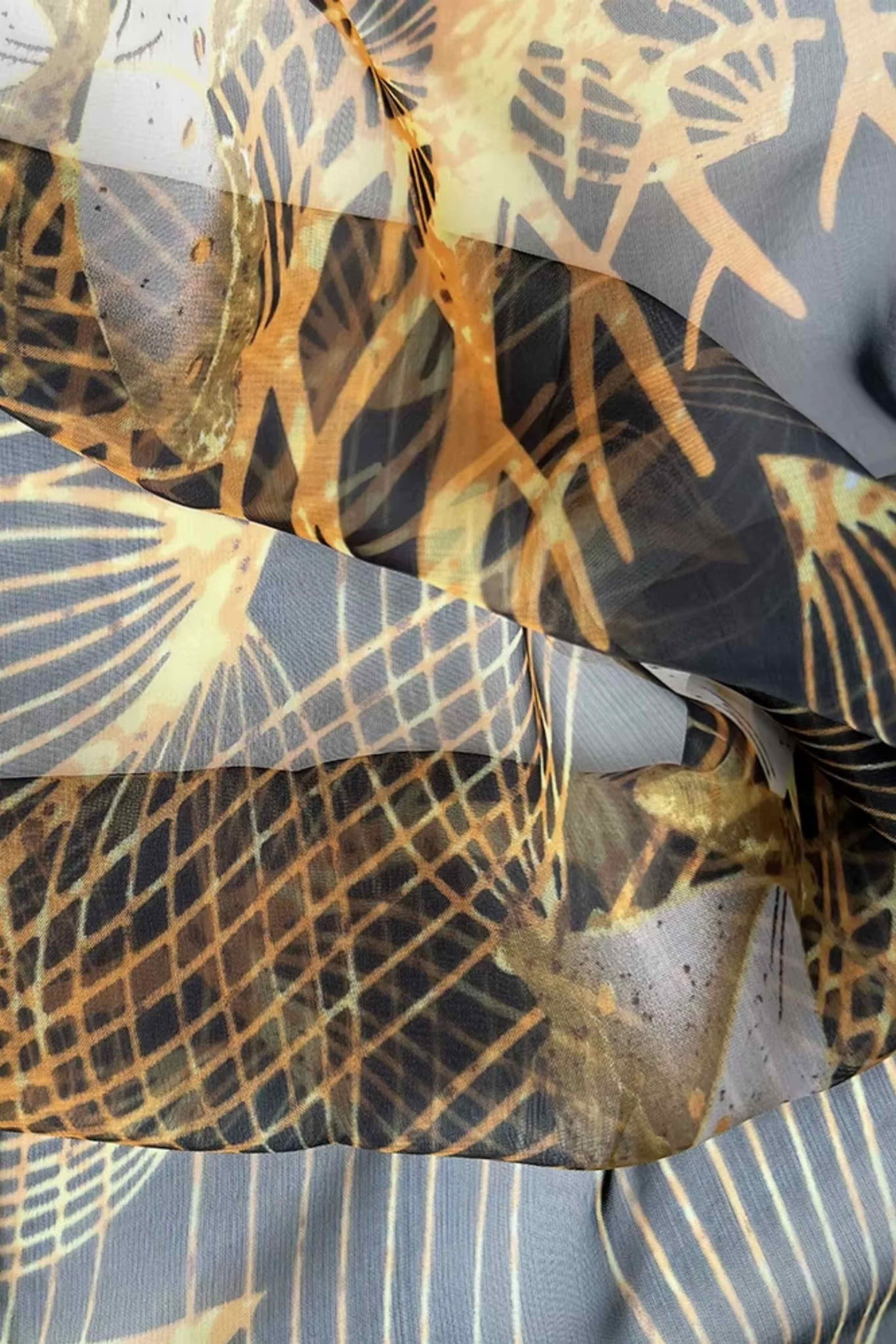 Ten luksusowy szal łączy nowoczesną elegancję z nutą egzotyki. Zdobiony efektownym motywem liści w odcieniach złota na głębokiej czerni, doda szyku zarówno do wieczorowej sukienki, jak i minimalistycznej stylizacji na co dzień.