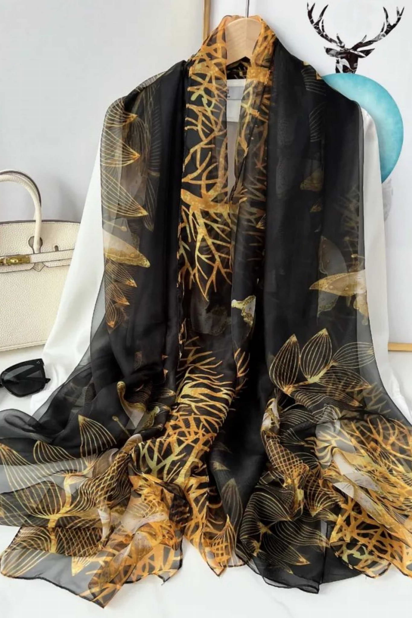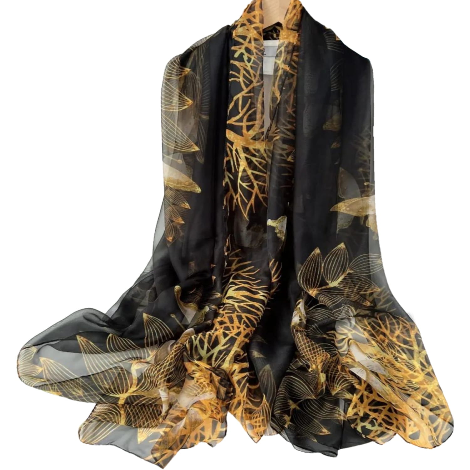 Przyciągający wzrok szal z roślinnym złotym motywem na czarnym tle. Zwiewny, lekki i niezwykle stylowy dodatek do każdej eleganckiej stylizacji.