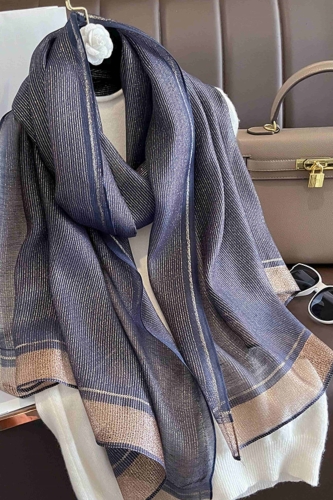 Elegancki szal w kolorze granatowym z połyskującym wykończeniem. Wymiary: 180 x 90 cm. Skład: 60% jedwab, 40% poliester.
