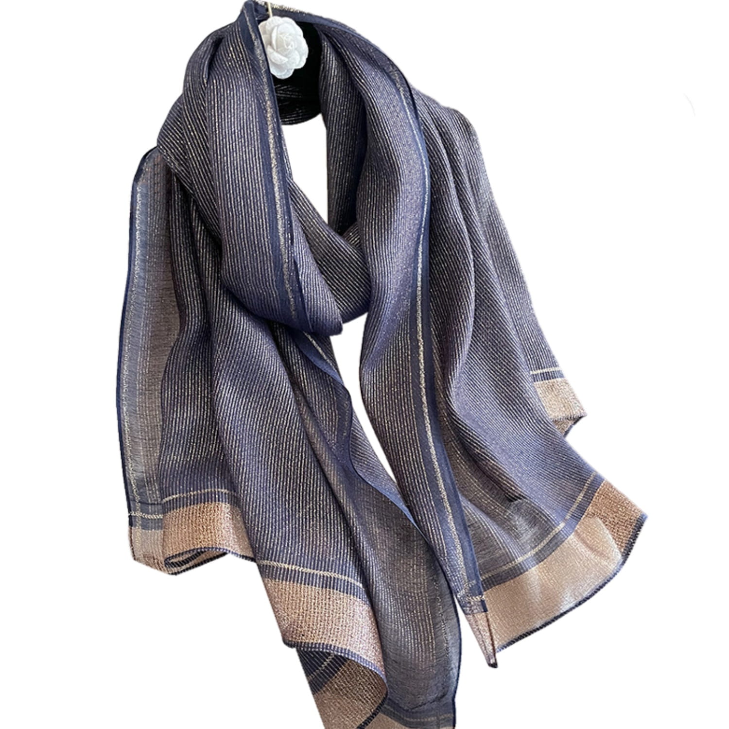 Stylowy granatowy szal z metalizującym połyskiem, wykonany z wysokiej jakości tkaniny – 60% jedwabiu i 40% poliestru. Doskonale sprawdzi się zarówno w codziennych, jak i bardziej eleganckich stylizacjach.