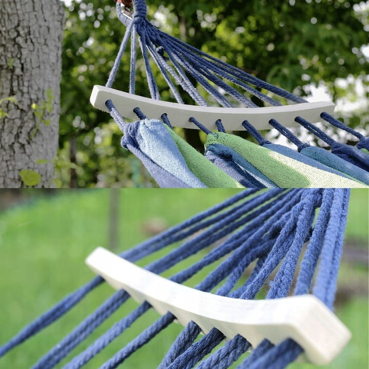 Wytrzymały hamak podwójny, pleciony, pleciony z oddychającej tkaniny z bawełny z domieszką poliestru, która przepuszcza powietrze. Zestaw z wyposażonymi linkami mocującymi, wyposażonymi hakami w postać litera S i pokrowcem.
