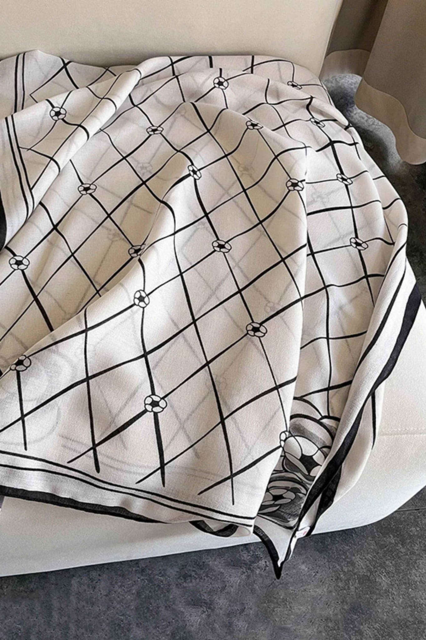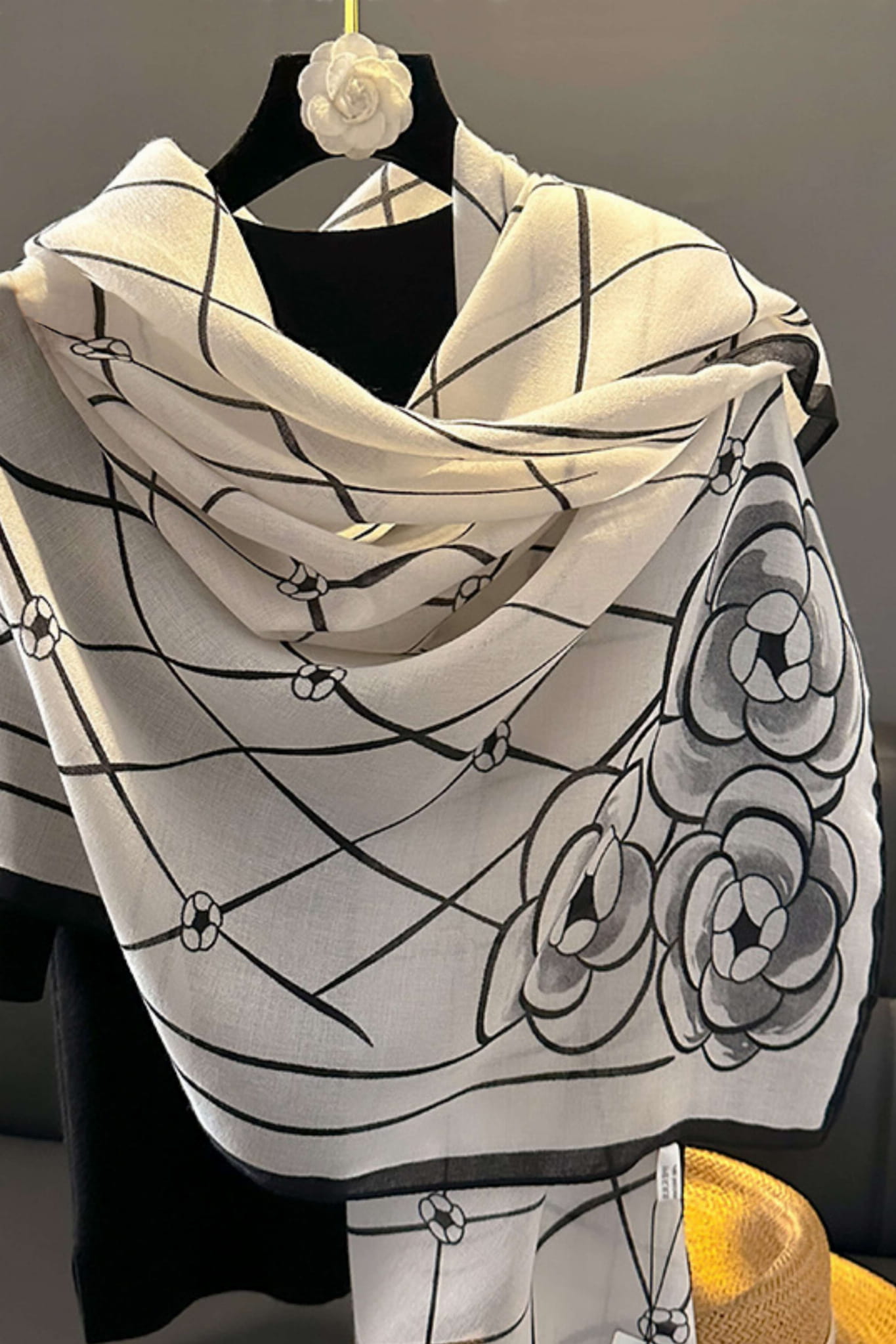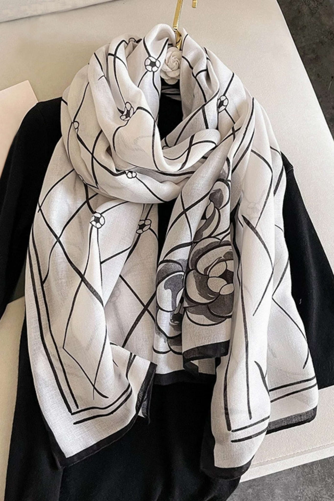 Jasny szal z czarnym wzorem – delikatność i charakter
