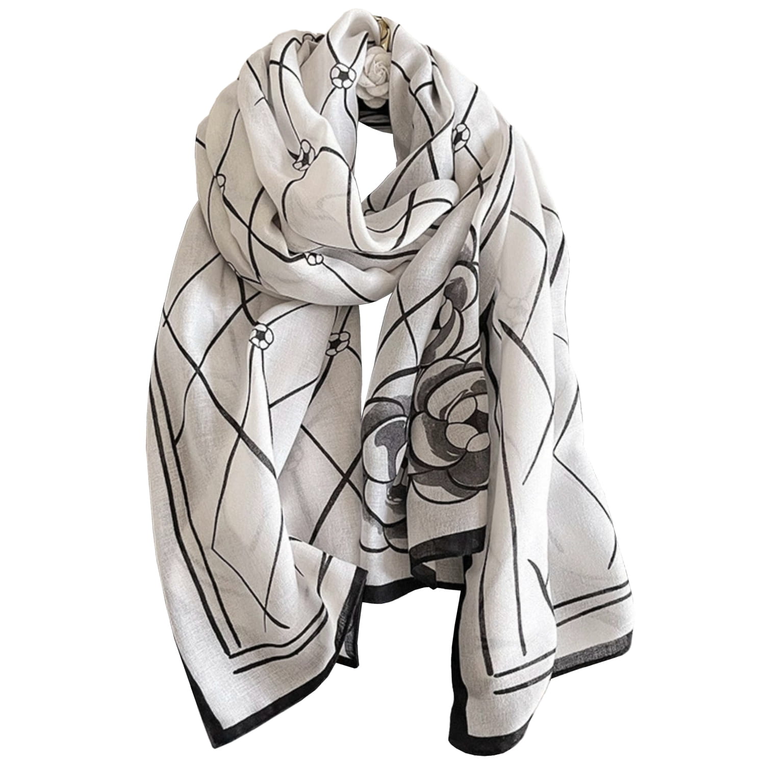 Subtelny jasny szal z wyrazistym czarnym wzorem – idealny dodatek do eleganckich i codziennych stylizacji.