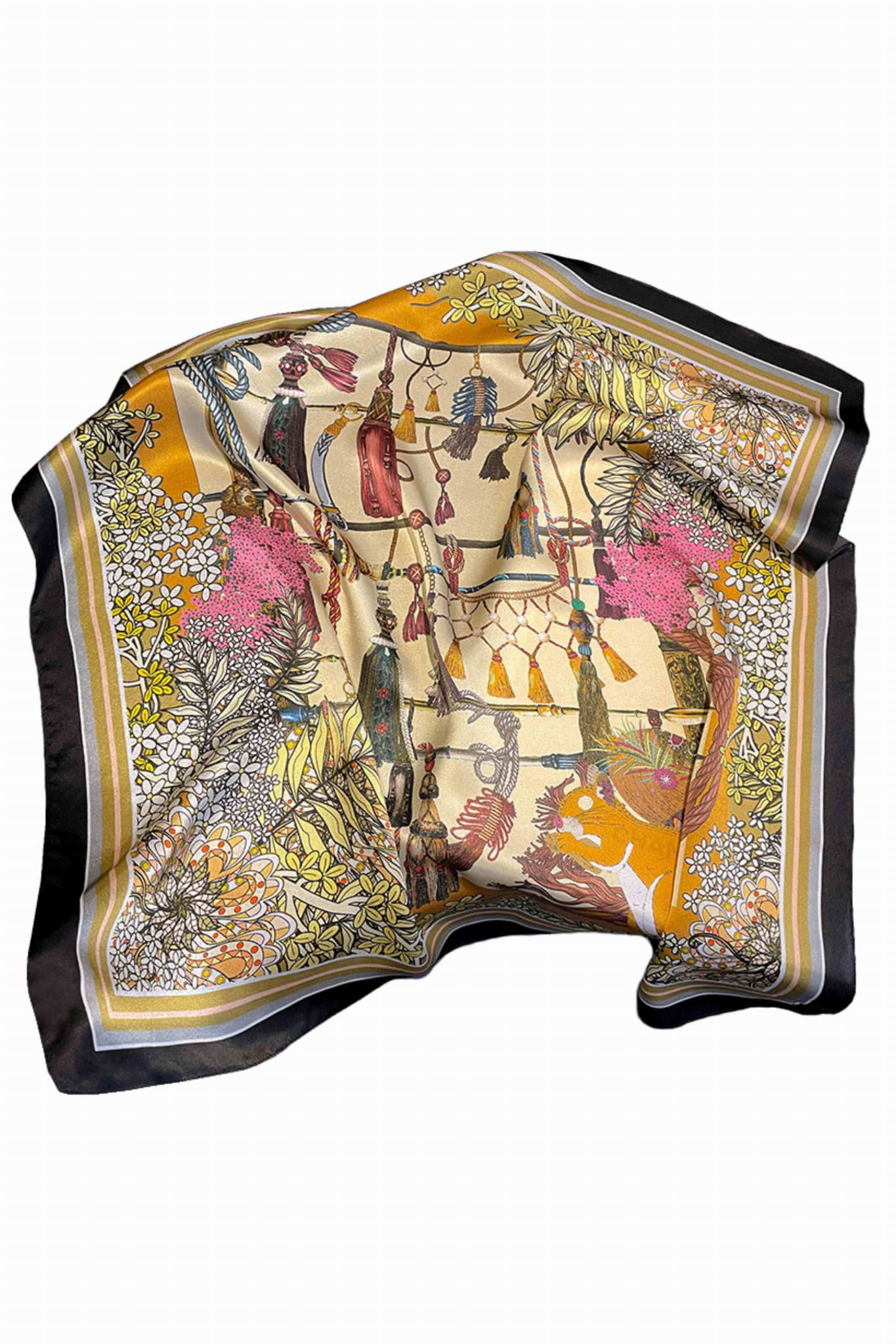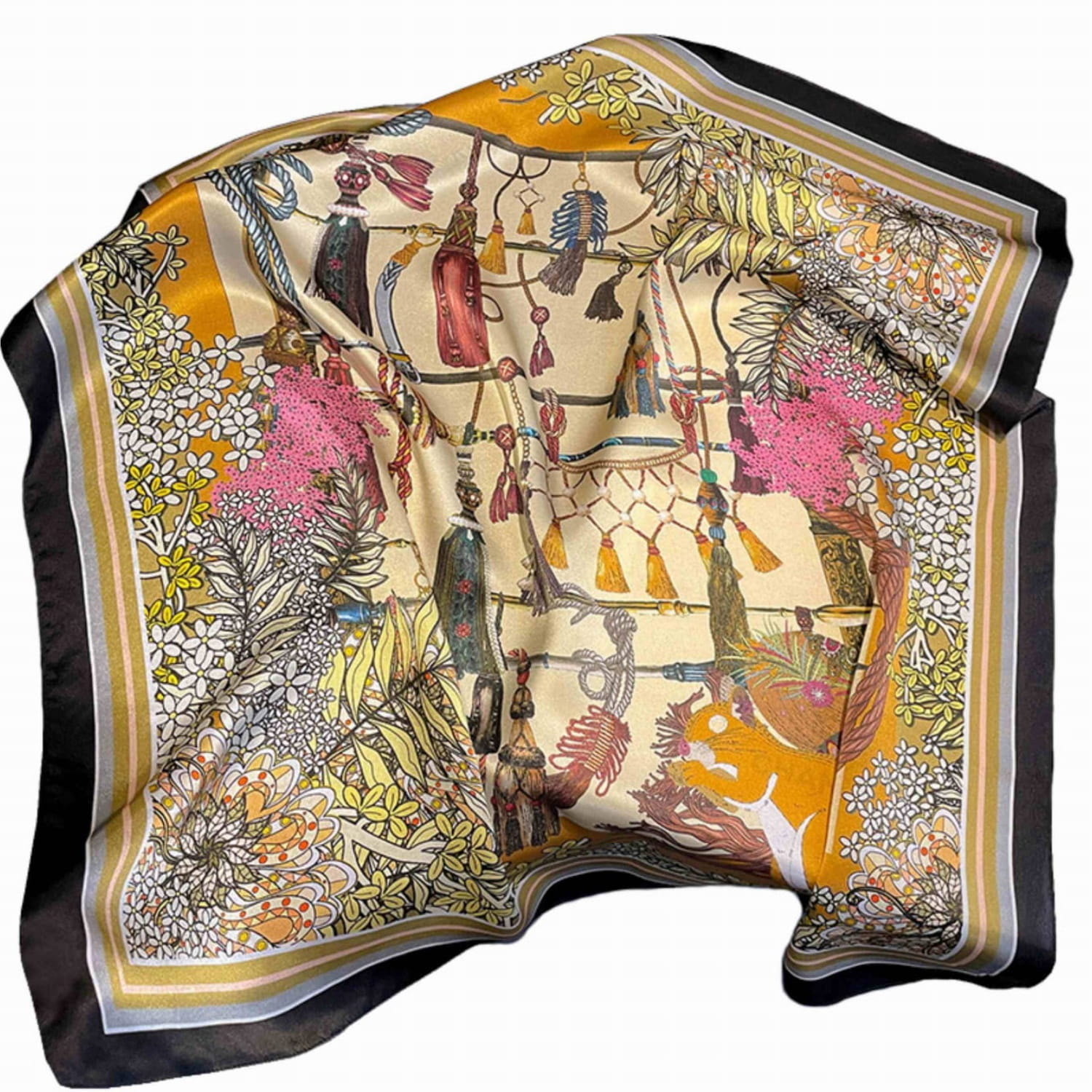Jedwabna apaszka 70x70 orientalna z motywem frędzli i roślin – Złoty Ogród