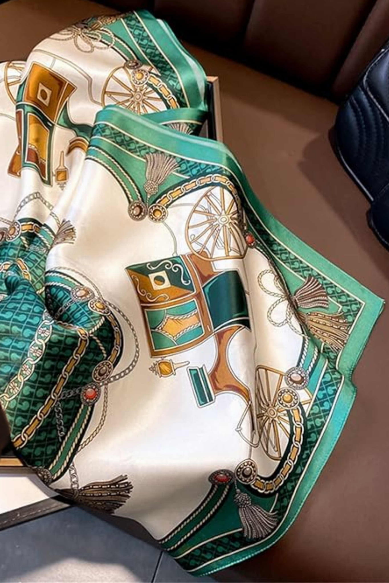 Luksusowa apaszka 70x70 z jedwabiu naturalnego z klasycznym motywem karoce i rozet w barwach zieleni i złota.