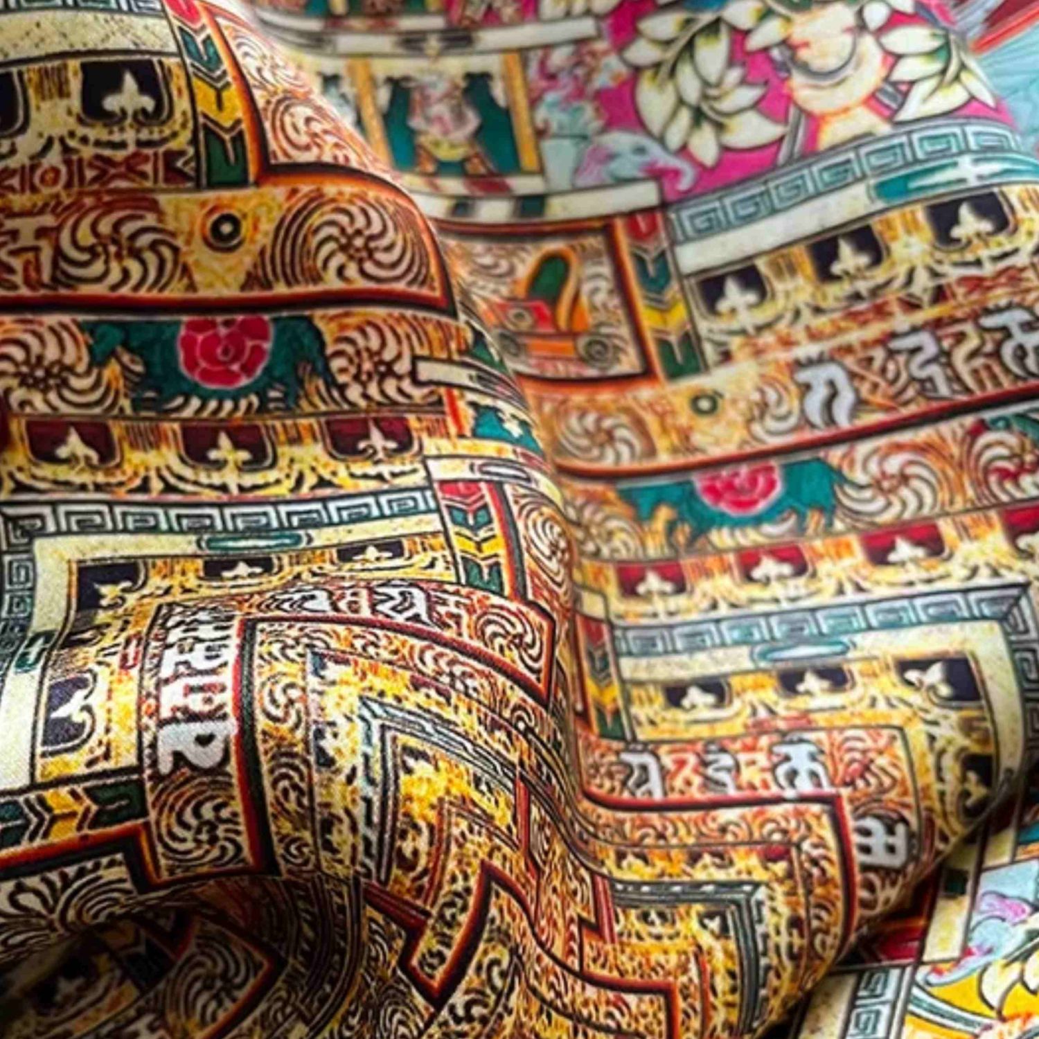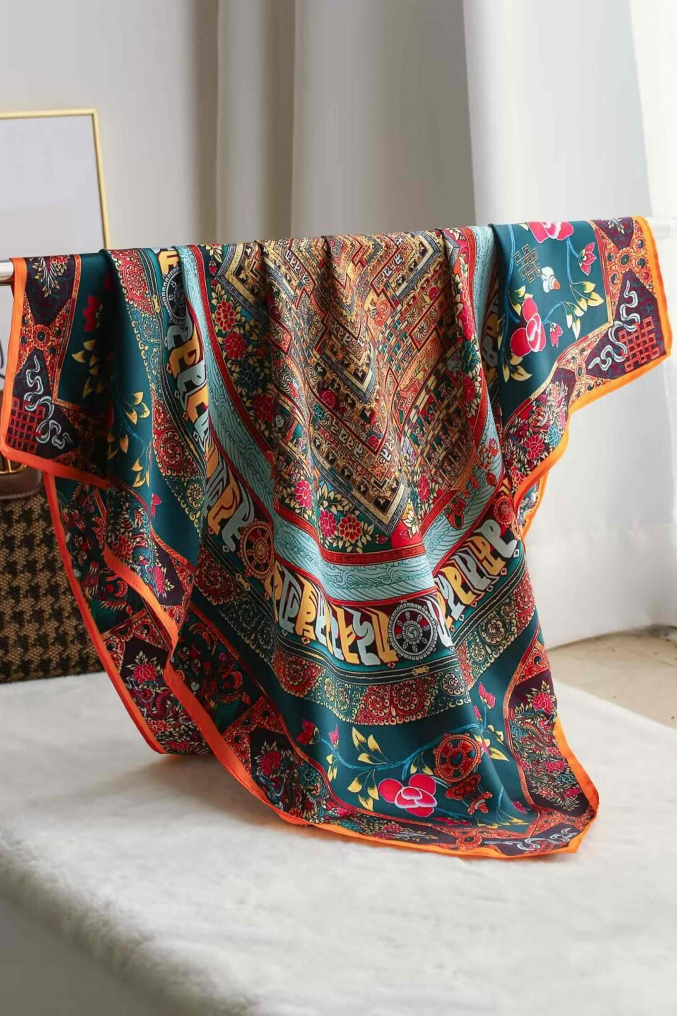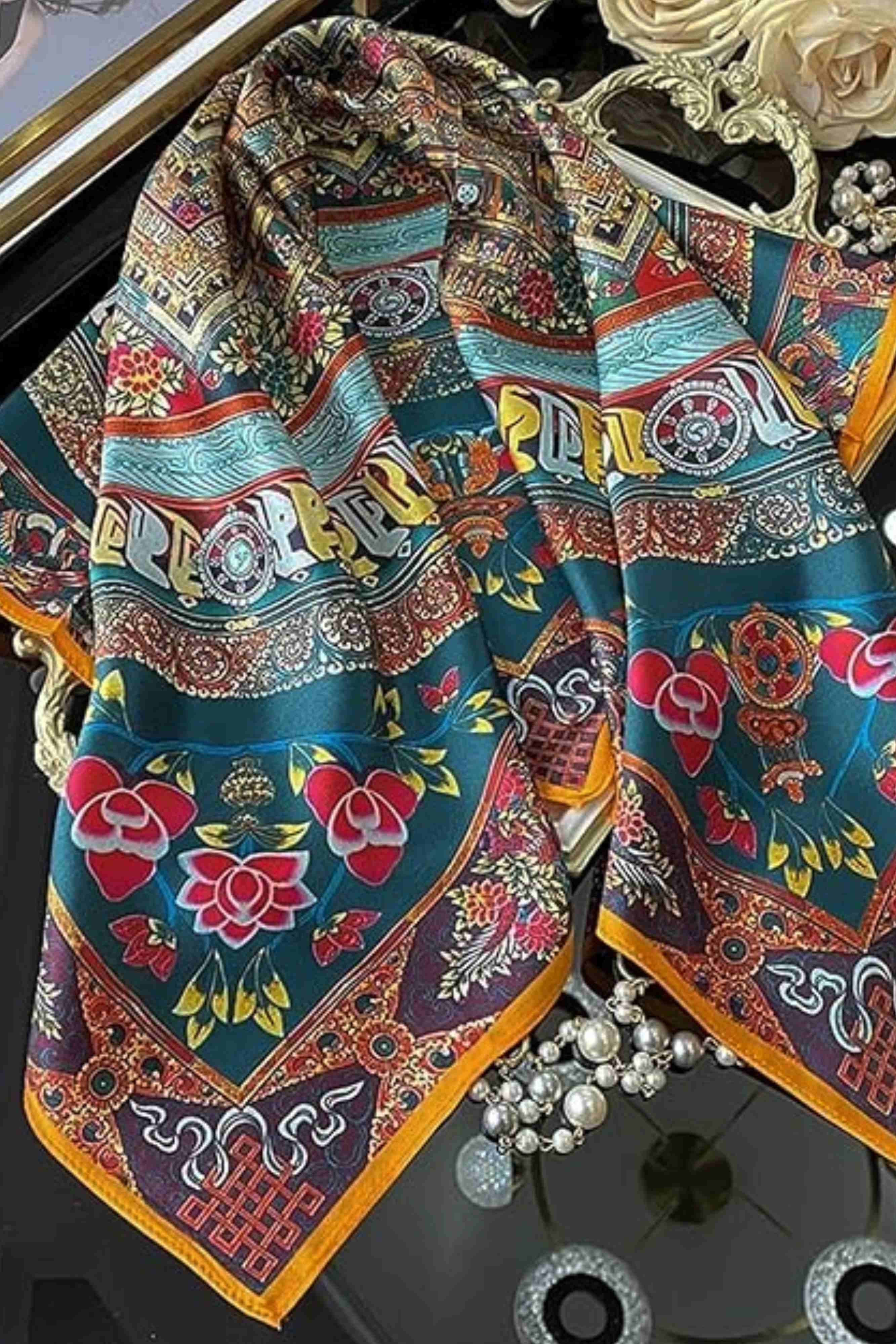 Orientalna jedwabna apaszka 70x70 z bogatym wzorem i intensywnymi kolorami – luksusowy akcent do eleganckich stylizacji.