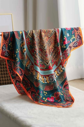 Odkryj egzotyczny urok i bogactwo detali w apaszce Oriental Majesty. Wykonana w 100% z jedwabiu naturalnego, ta elegancka apaszka przyciąga wzrok intensywną paletą barw: głęboką zielenią, karminem, złotem i turkusem, tworząc efektowny wzór inspirowany sztuką orientalną.
