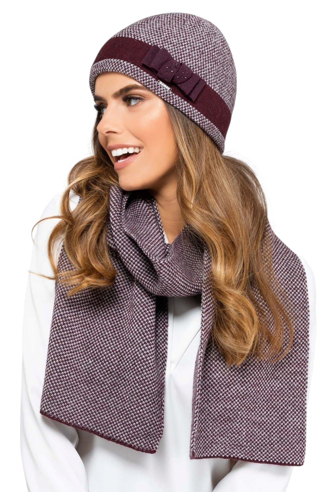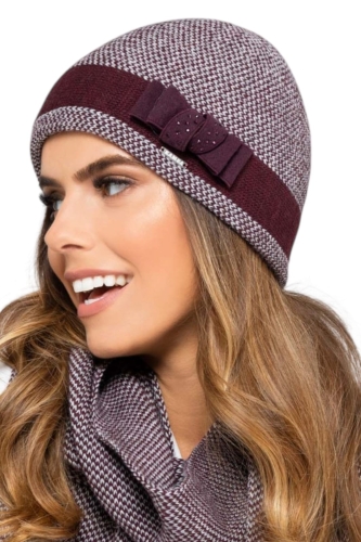 KATALONIA – czapka damska zimowa w pepitkę z kokardą, burgund
