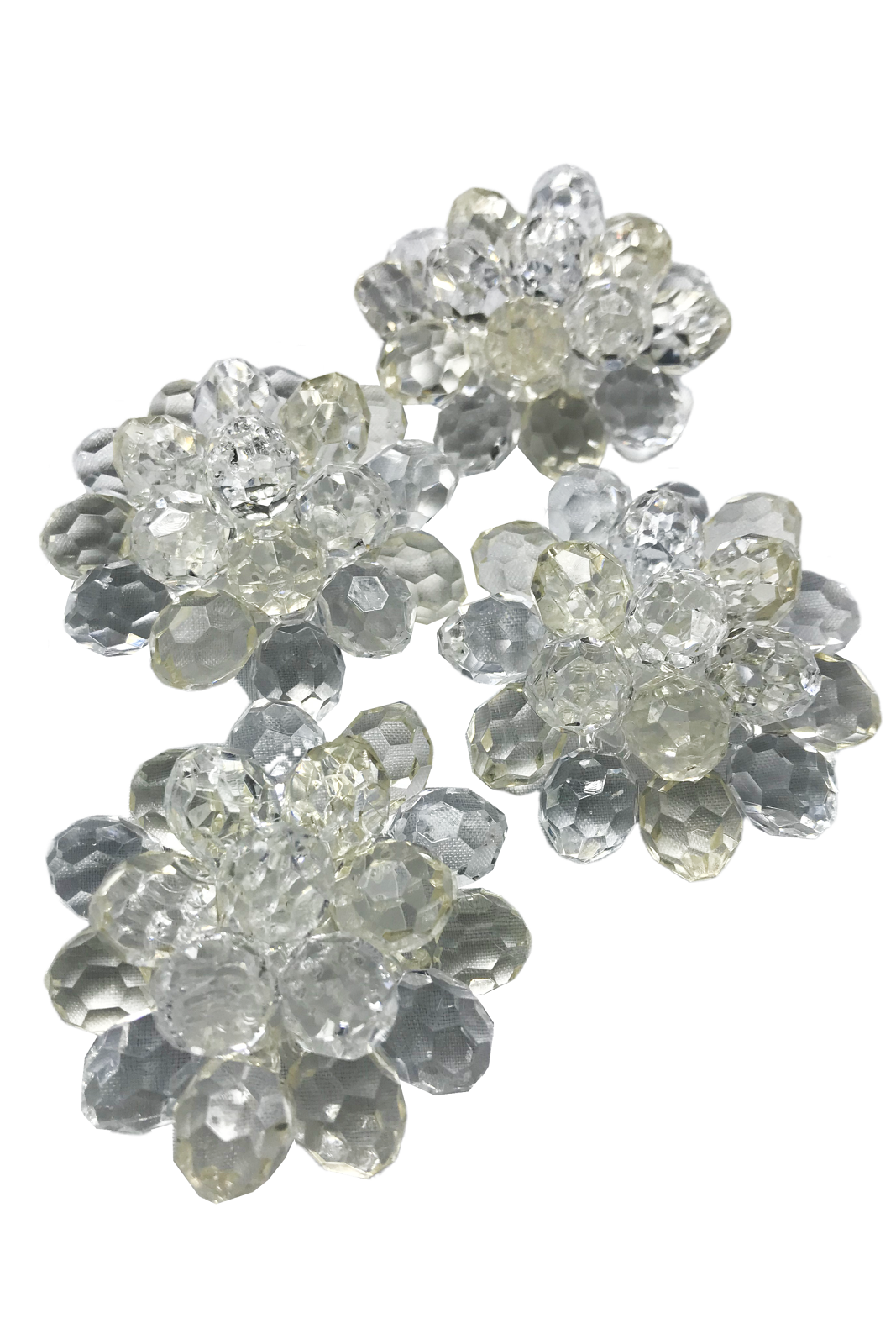 Duży kwiat z plastikowych, imitujących kryształ przezroczystych korali. Pięknie odbija światło, będzie bardzo efektowną ozdobą ubrań i dodatków.