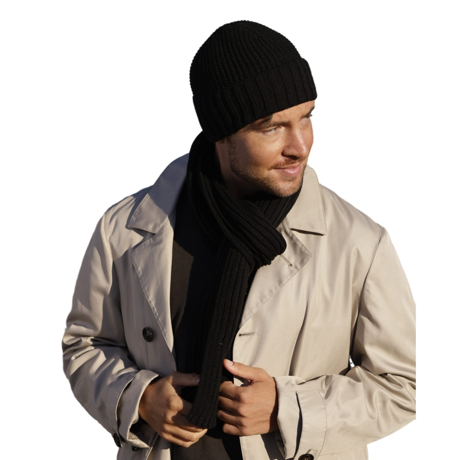 Wygląd i detale. Głęboka czerń porządkuje styl i podkreśla pionowy prążek. Czapka układa się gładko (bez mankietu), krawędź wykończona równo; szalik powiela fakturę i kolor — minimalistyczny komplet bez zbędnych ozdób.