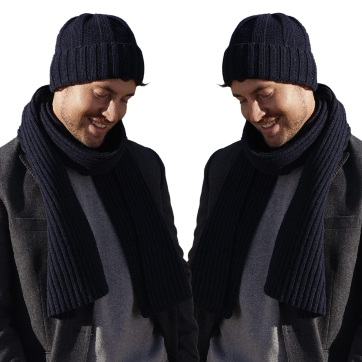 Wygląd i detale. Granat podkreśla rytm prążka i nadaje kompletowi czystą, męską linię. Czapka z wyraźnym mankietem porządkuje krawędź przy czole, szalik powtarza tę samą fakturę — spójność i minimalizm bez zbędnych ozdób.