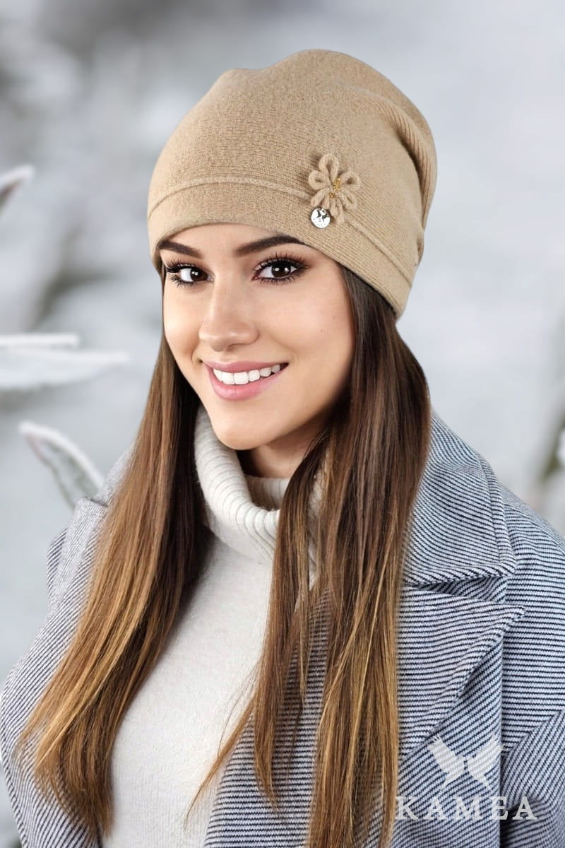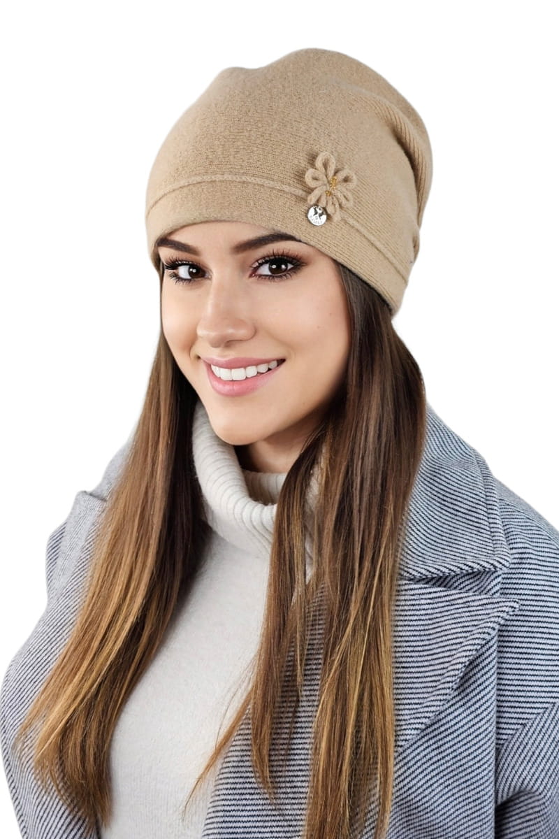 MARUNA wełniana czapka damska z delikatną ozdobą kolor piaskowy