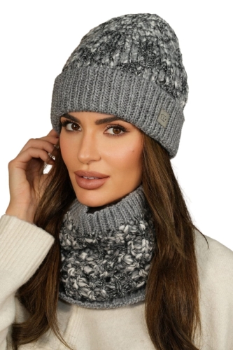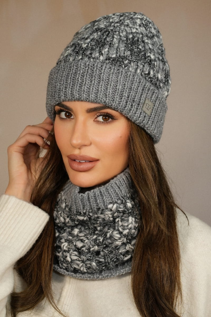 Modny, kolorowy komplet składający się z czapki i komina, wykonany z wysokiej jakości przędzy z zawartością wełny z alpaki.