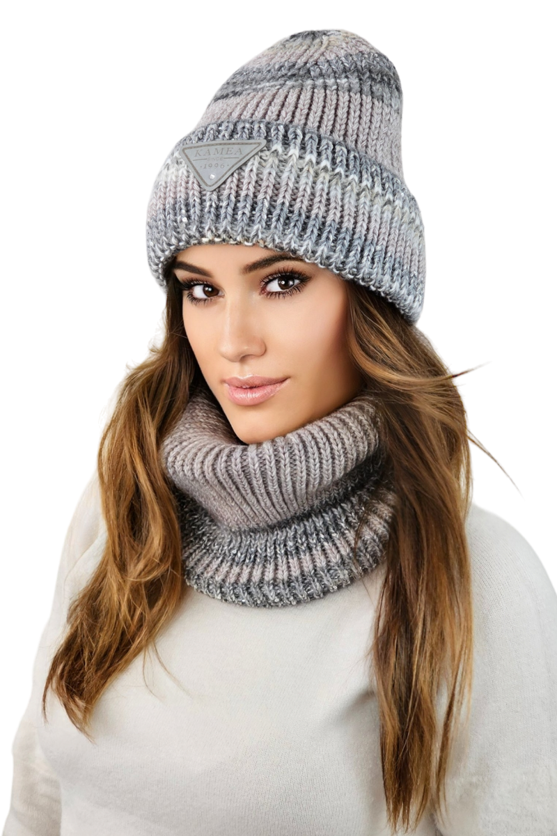 MUSCARI zimowa czapka damska w paski z cekinami kolor beżowy
