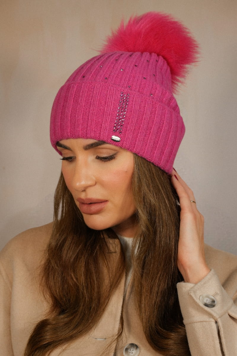 Nila wełniana czapka w prążek z eco pomponem i cyrkoniami kolor malinowy