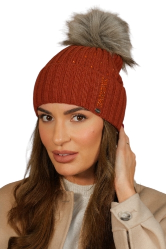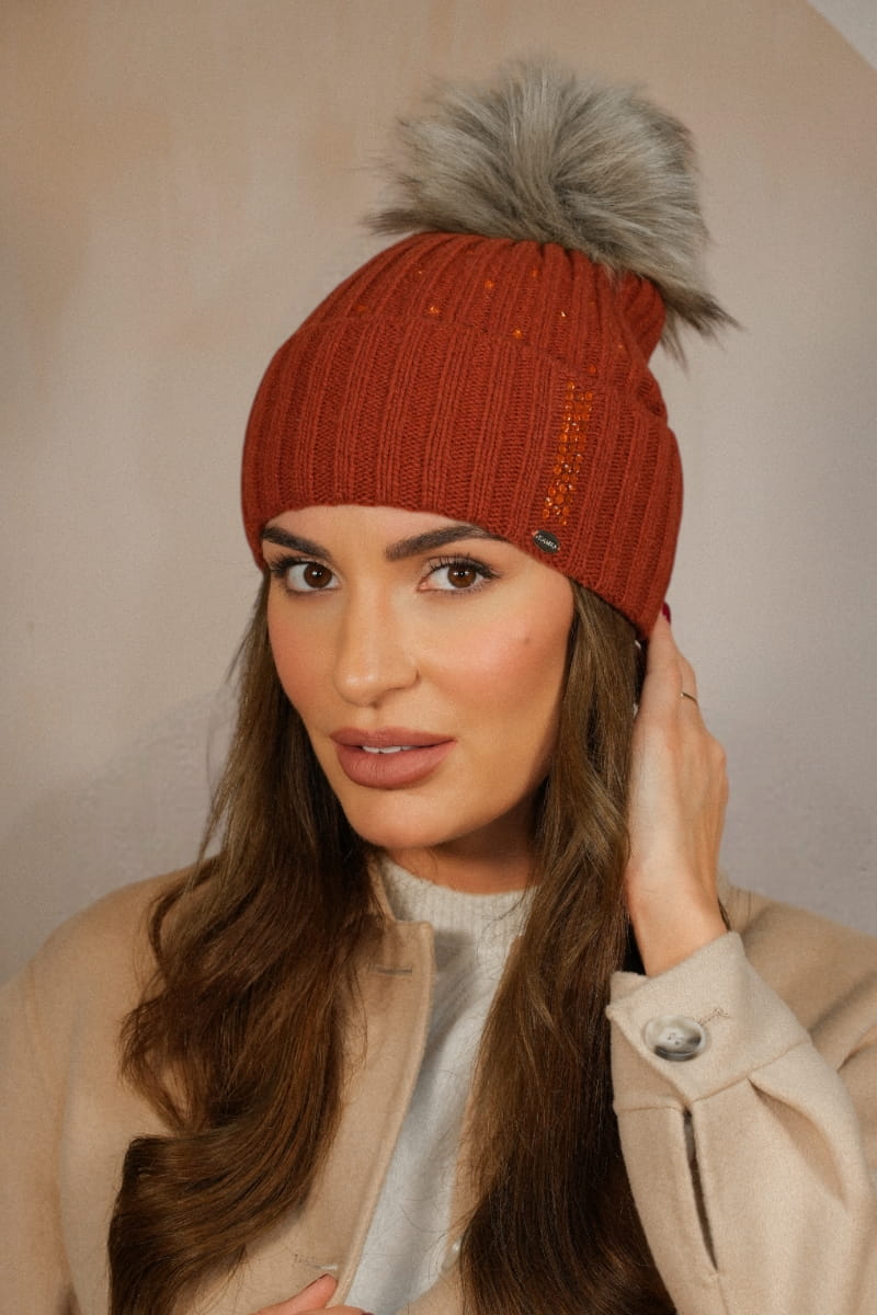 Nila wełniana czapka w prążek z eco pomponem i cyrkoniami kolor rudy