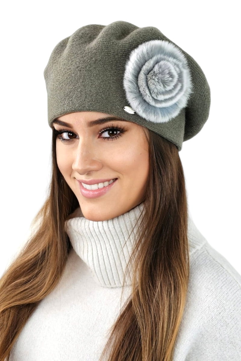 ORCHID zimowy damski beret z ozdobą z królika kolor khaki