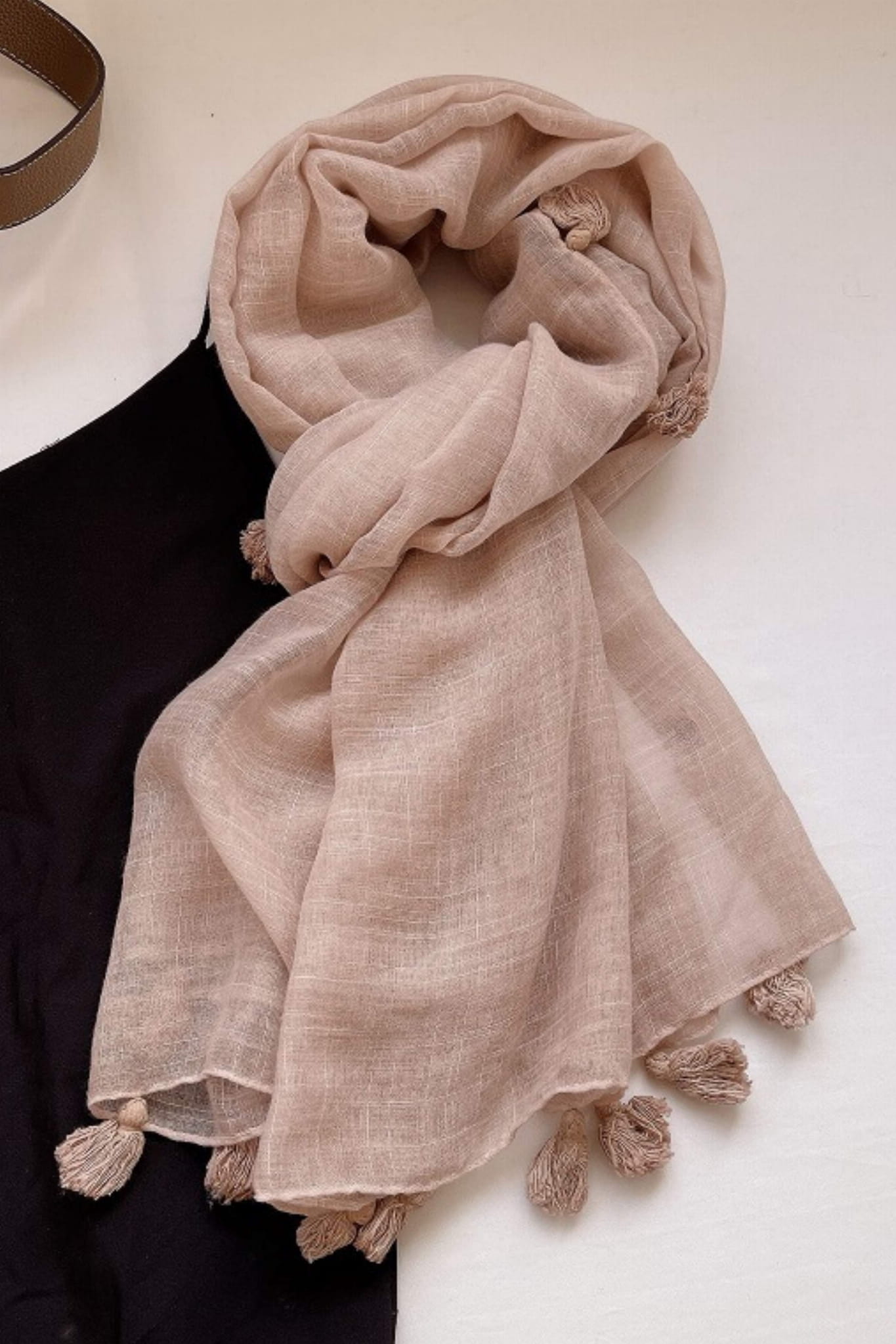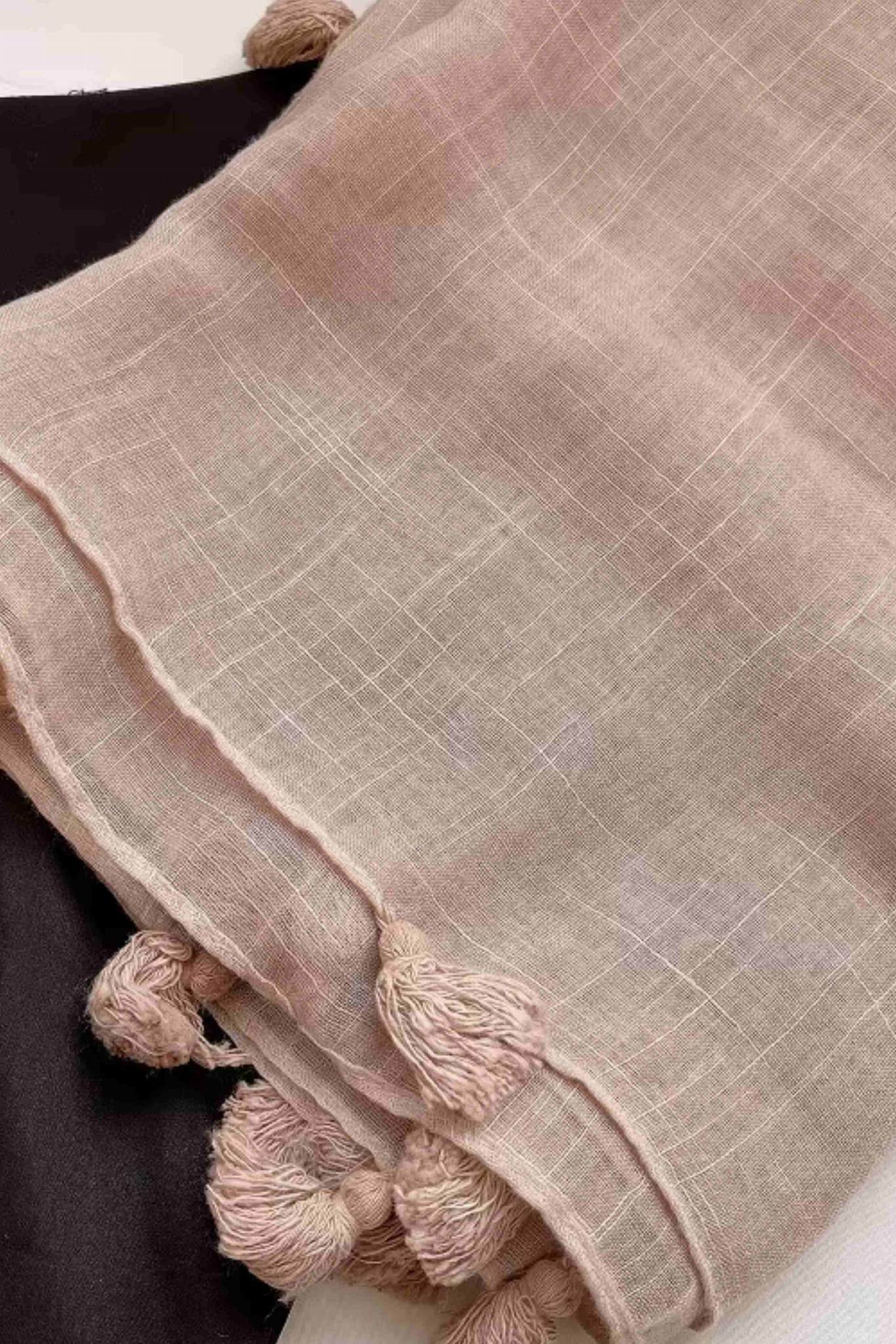 Pudroworóżowy szal z frędzlami – romantyczny akcent do każdej stylizacji